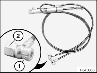 Use the plugs (1) and cap nuts (2) from the "Banjo bolts for hydraulic unit" set (sourcing reference: BMW Parts Service) and the old seals for this purpose.