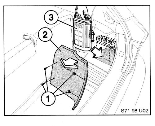Lift up the cover over tool tray, and use screwdriver from tool kit or a coin to remove the four plastic retainers (1) holding cover (2) in right rear corner of trunk. Remove the unit (3) from its shipping container and place it in the receptacle as illustrated. The hoses and wires on the unit must face towards the outside of the car. Secure unit with the hook and loop strap provided. Reinstall cover and retainers.