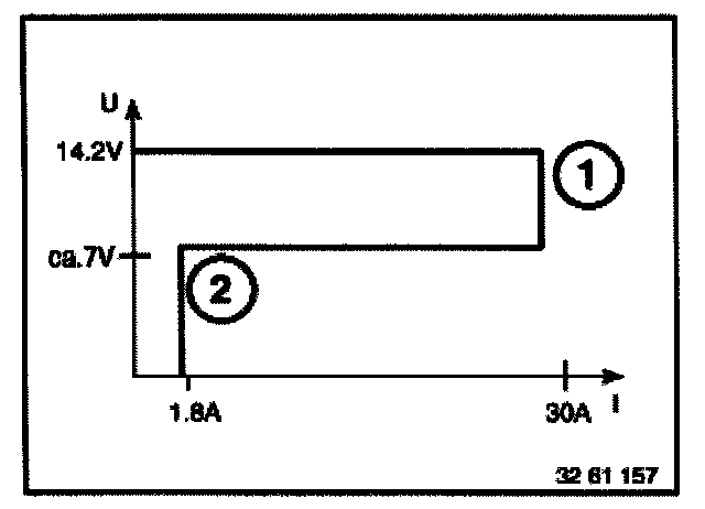 2. Charging seriously discharged batteries with an initial current of approx. 2 A up to terminal voltage of approx. 7 V, at which maximum charging current cuts in.