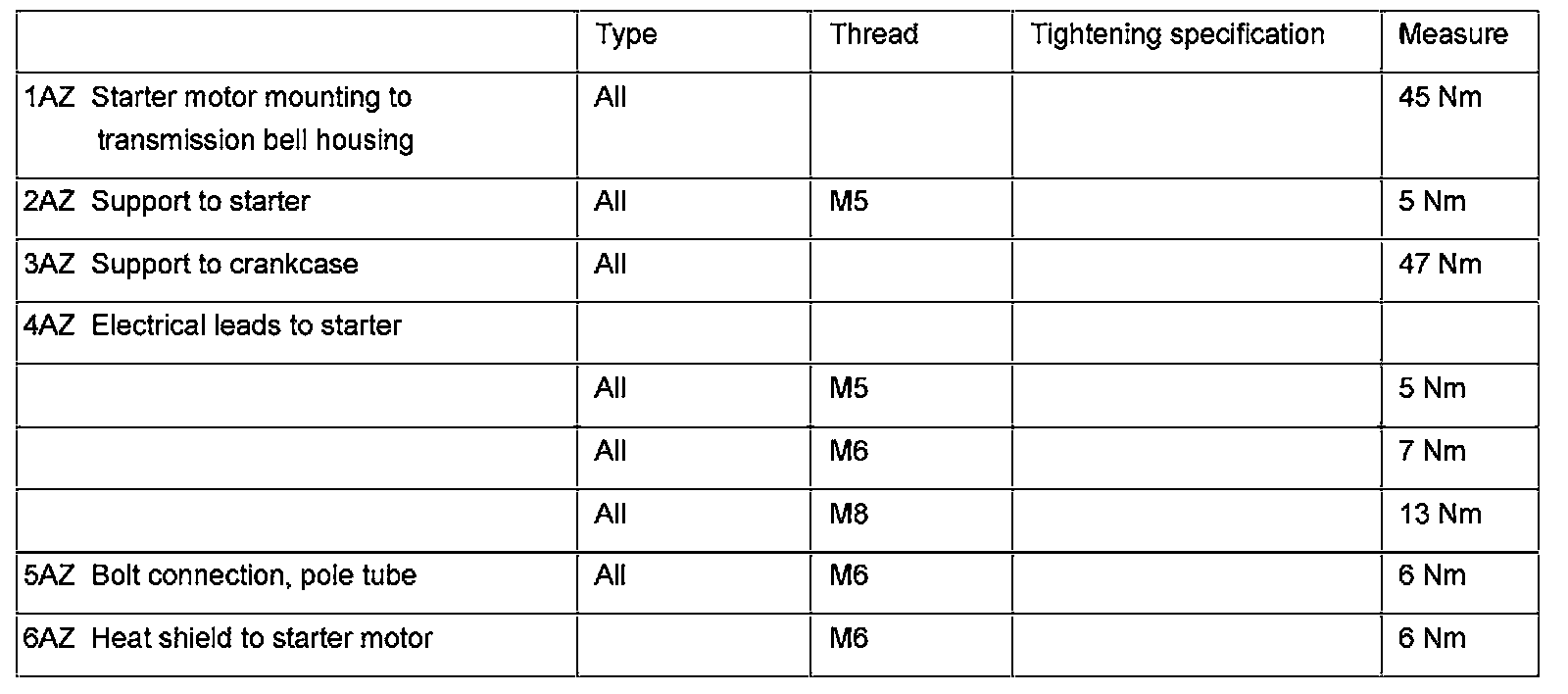 - Tightening Torque, refer to chart below