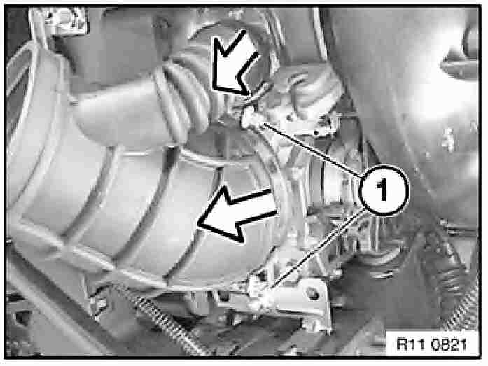 - Disconnect plug connection (1) on air mass flow sensor.