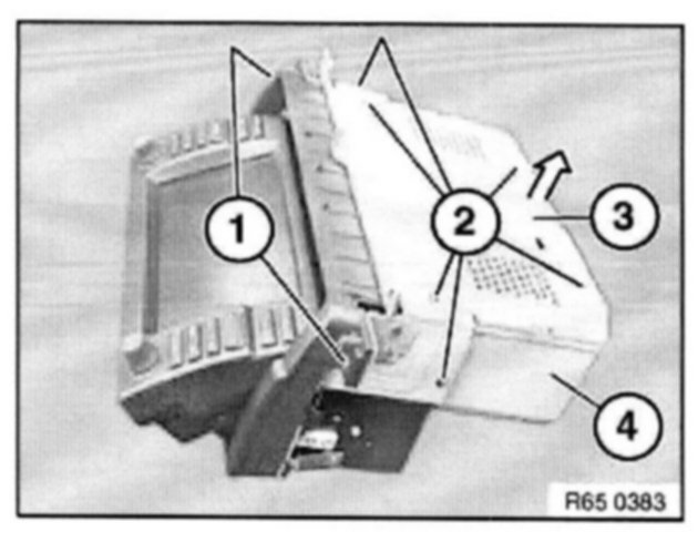 Remove trim for on-board monitor (1) in direction of arrow from housing (2).