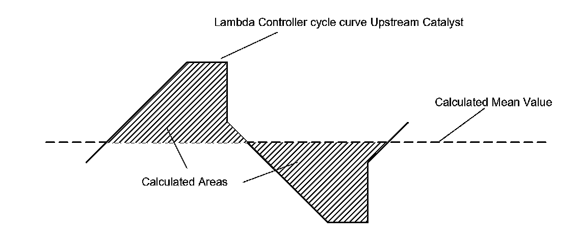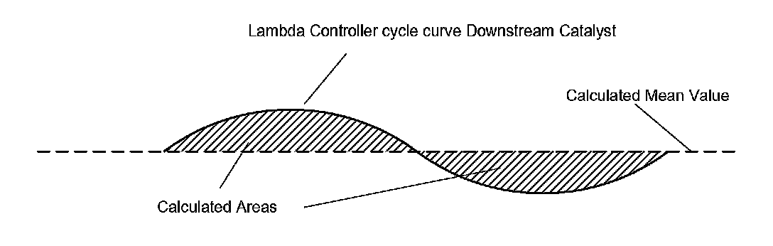 In order to determine the catalysts efficiency a fixed number of complete lambda controller cycles (oxygen oscillation from upstream sensor) are used to calculate the areas which are enclosed by the controller cycle curve and is also calculated mean value. The average of all areas displays the magnitude of the oxygen admission to the catalytic converter.