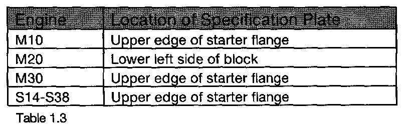 The older engines have the specification plate located as follows: (see table 1.3)