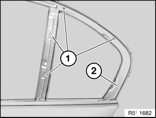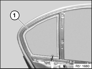Treat door window around glued area (1) with materials approved by BMW (repair kit, sourcing reference: BMW Parts Service).