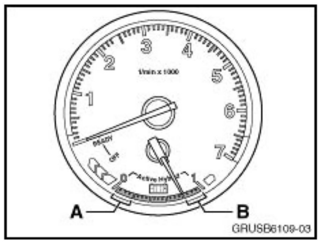 The charge status of the high-voltage battery pack is shown in the instrument cluster. If the charge indicator displays a state of charge in the lower quarter of the gauge (A), the high-voltage battery pack must be recharged until the charge indicator displays a value in the upper quarter (B).