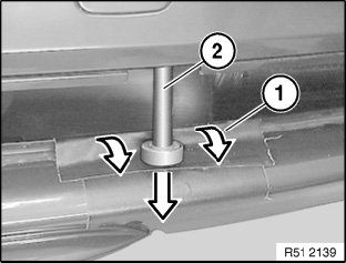 Pull bumper (1) towards rear/bottom and remove screw (2) towards rear/bottom.