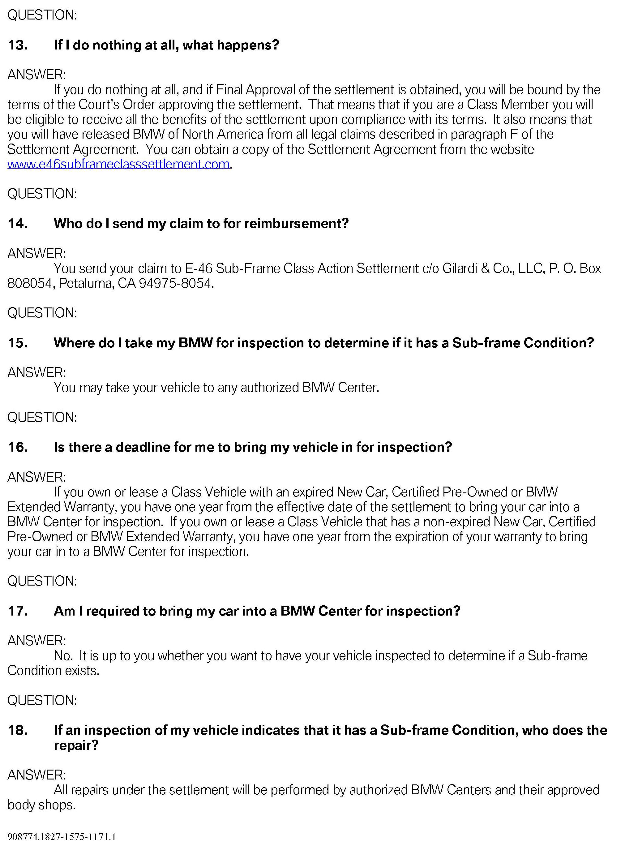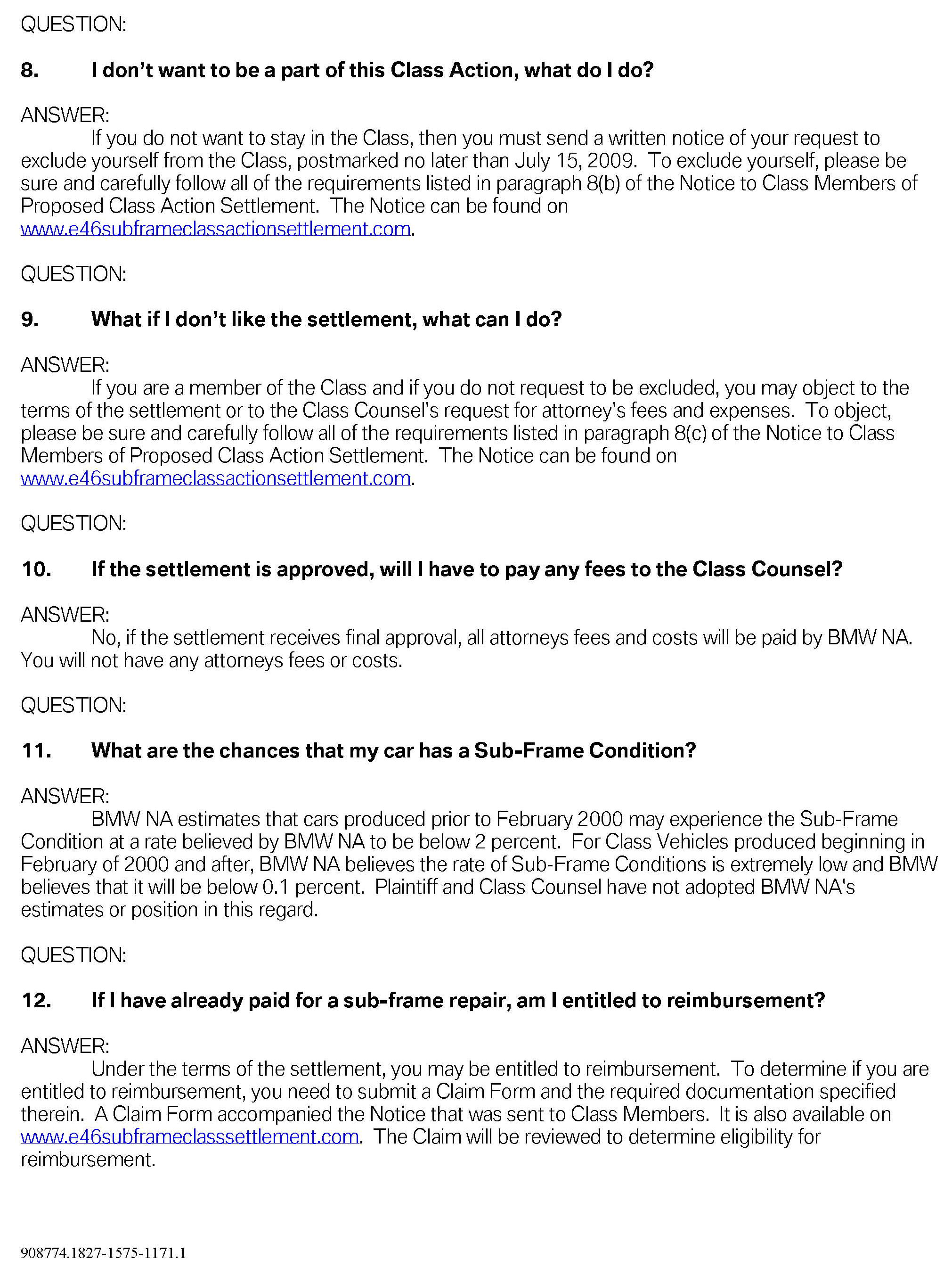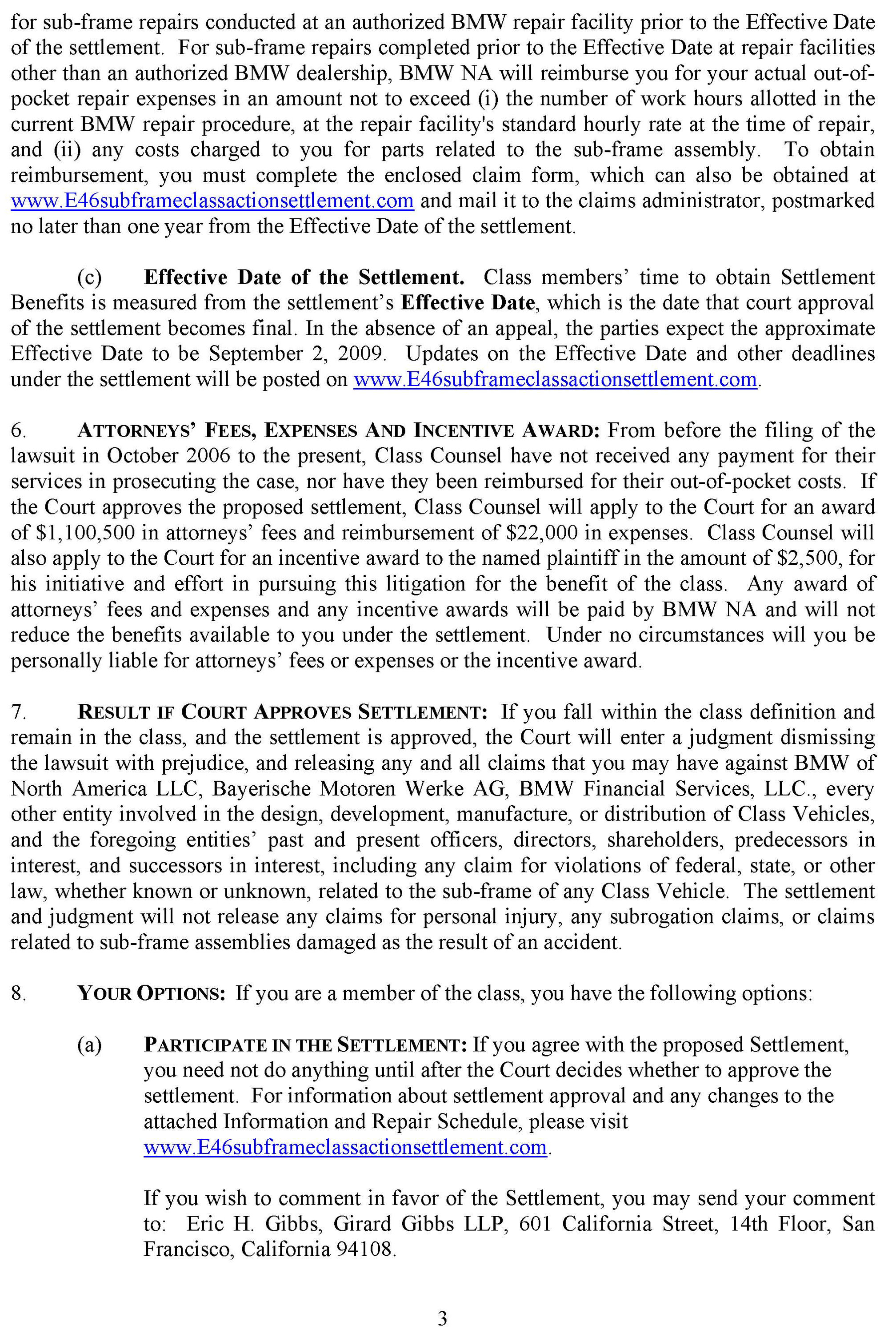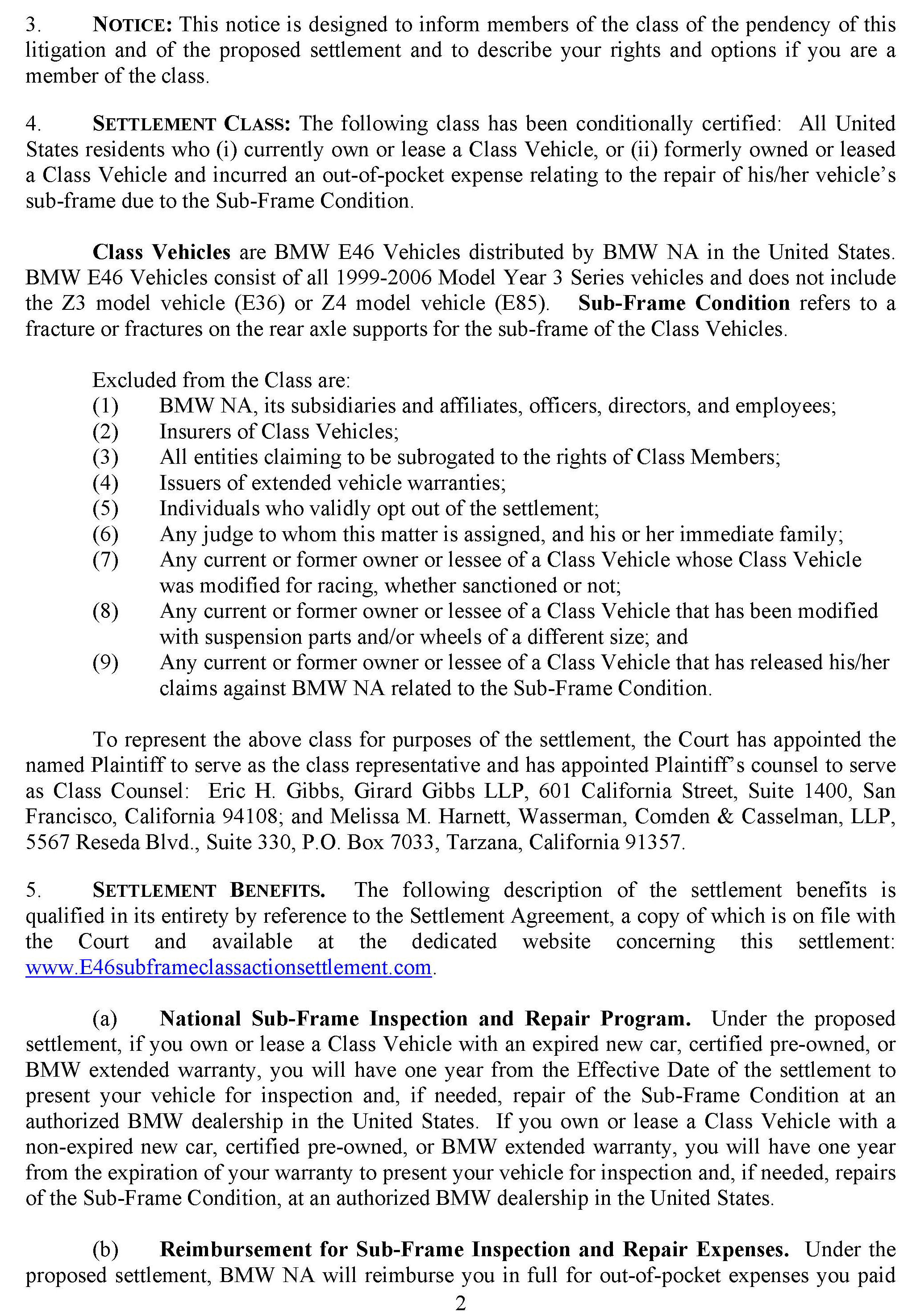 For additional details and questions surrounding this proposed settlement, please refer the customer to the following website dedicated to this topic: www.E46subframeclassactionsettlement.com ; or contact by phone at 1-866-215-8458.