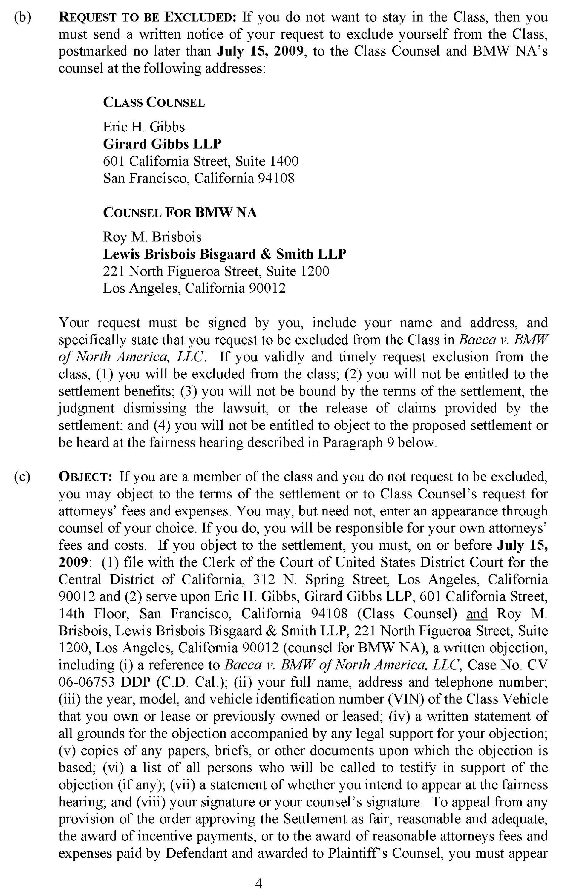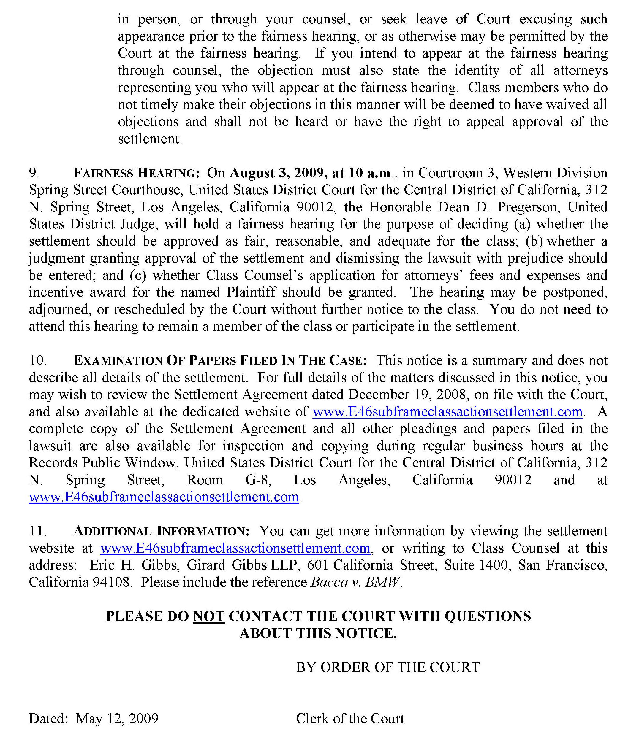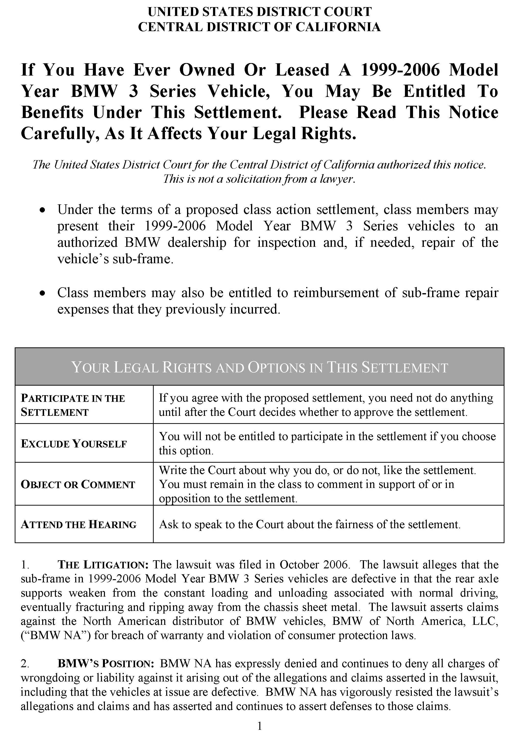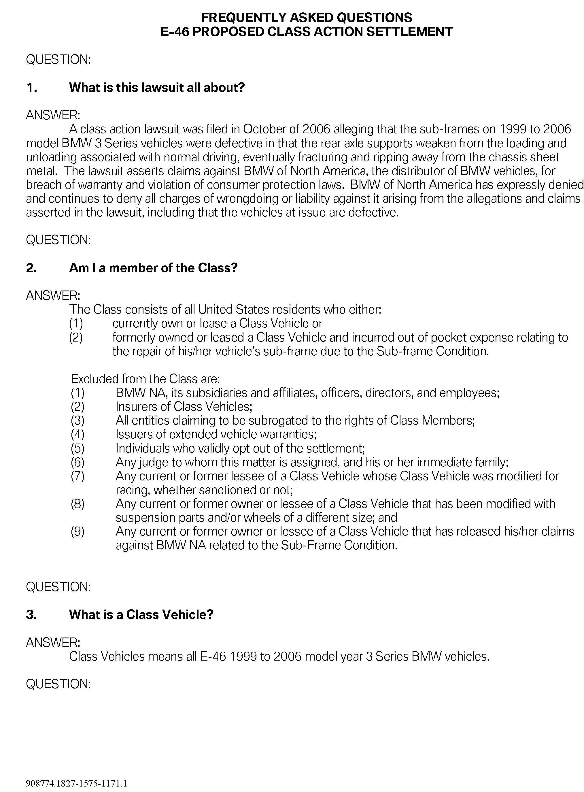 For additional details and questions surrounding this proposed settlement, please refer the customer to the following website dedicated to this topic: www.E46subframeclassactionsettlement.com ; or contact by phone at 1-866-215-8458.