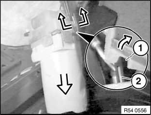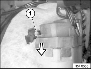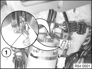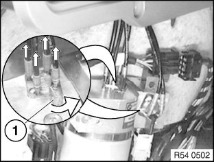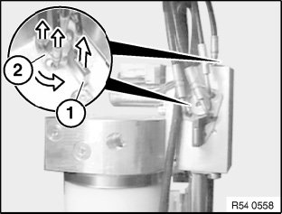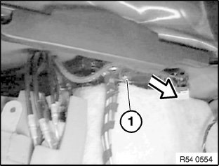 Bend back plastic retainers (1) slightly from hydraulic line and detach towards top.