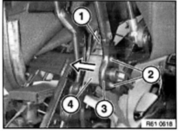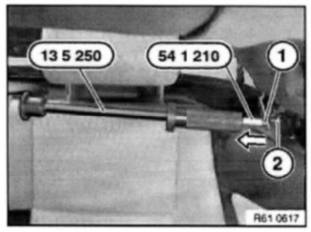 Drive bolt (1) with special tools 13 5 250 and 54 1 210 in direction of arrow out of support (2).