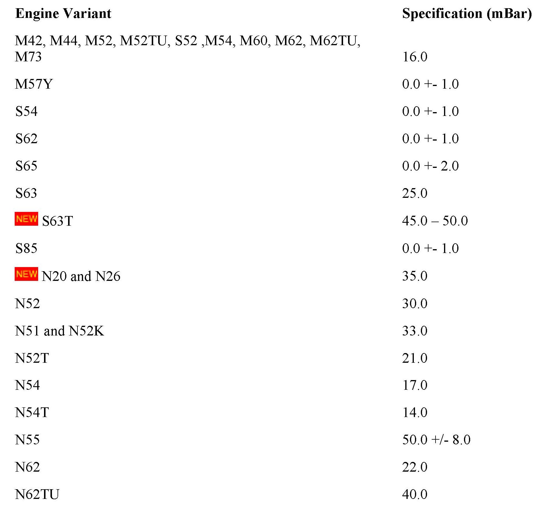 [NEW] Specification and actual readings from the vehicle may vary by up to +/-10%, but not more than 5.0 mBar. Various measuring tools may provide results that are not within specification. All measurements below were recorded using the IMIB. See the attachment for IMIB connection hints.