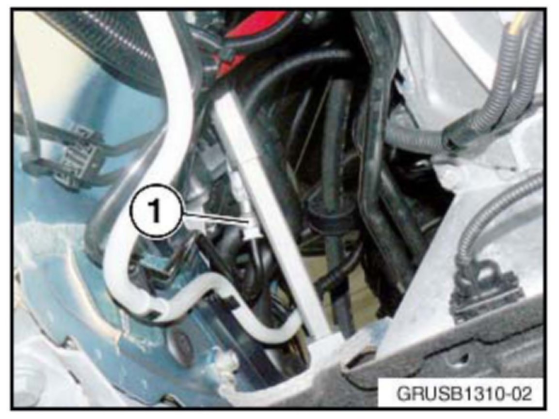 2. Lift the vehicle to access the under body cover protecting the low pressure connection (1) near the left frame rail.