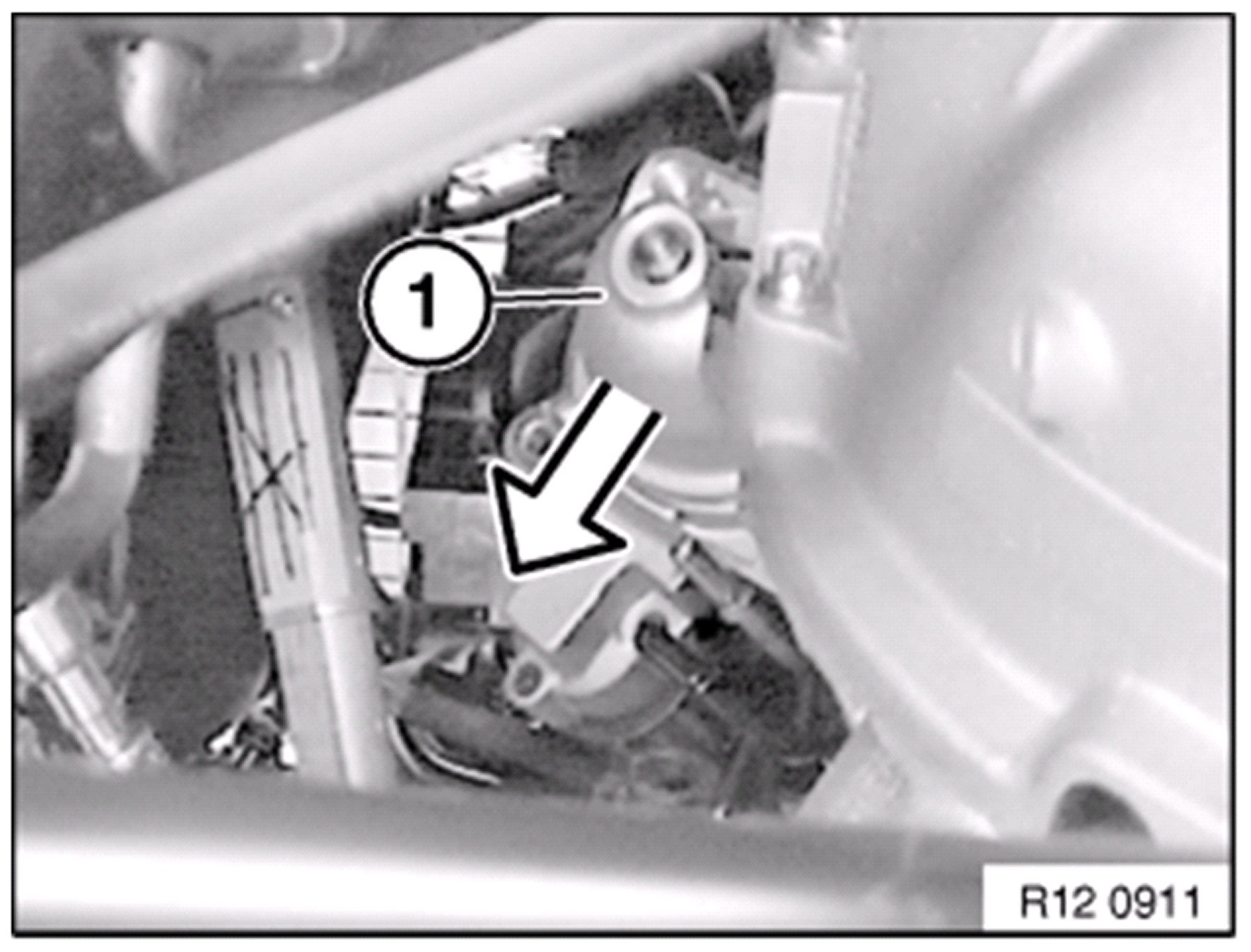 Loosen both starter motor mounting bolts ( 1 ) on transmission: