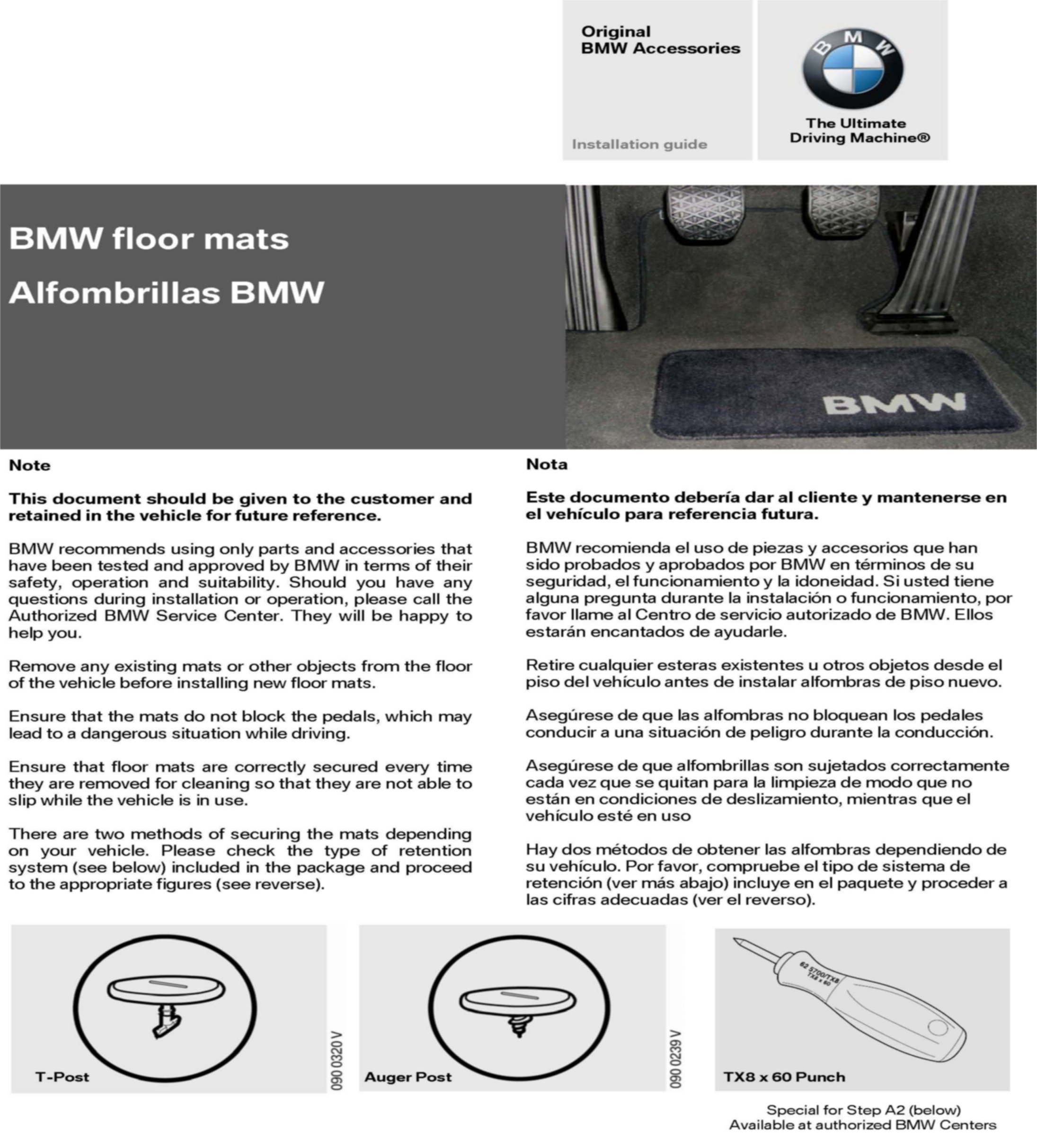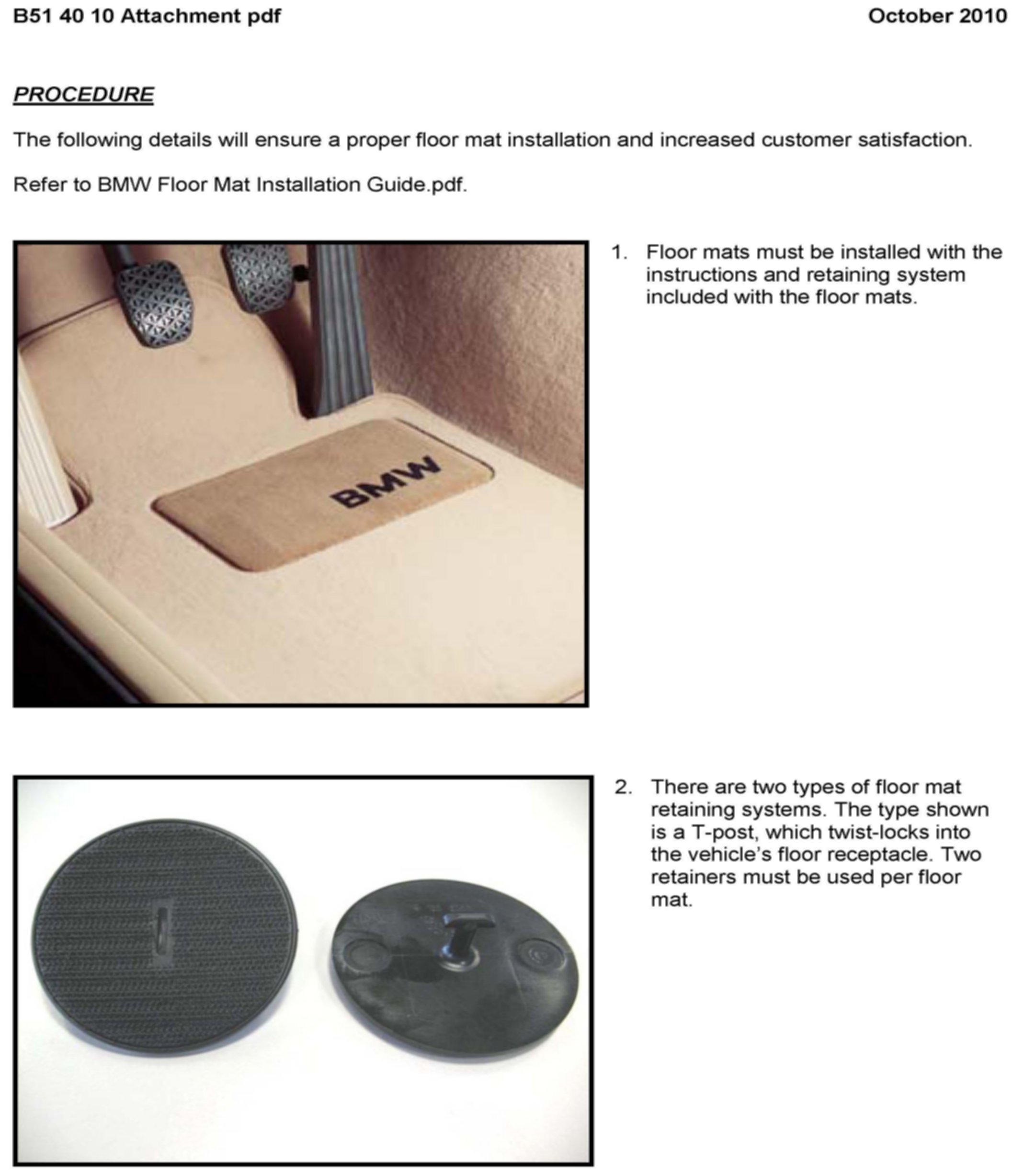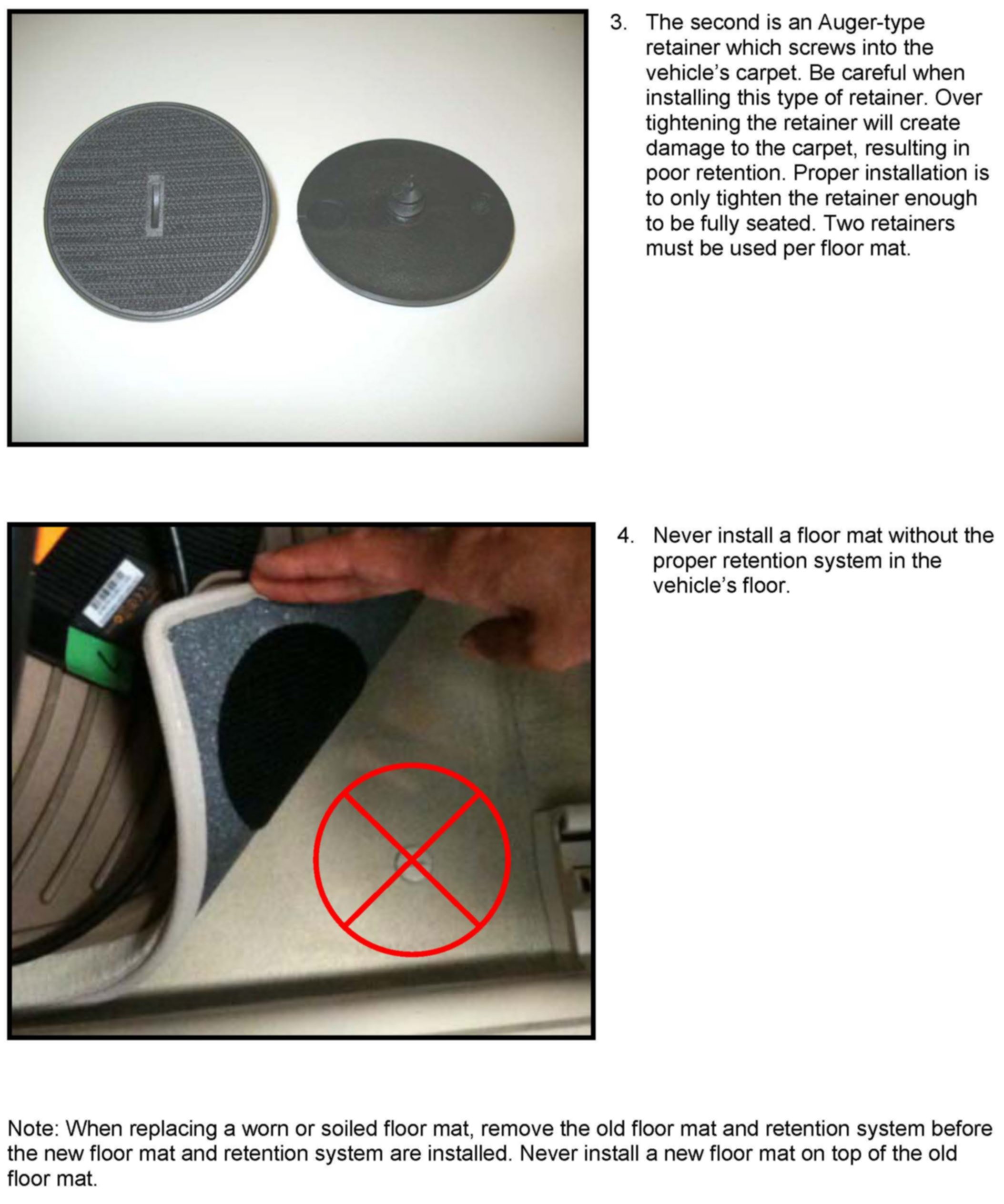 The intent of this bulletin is to ensure proper carpet floor mat installation and increase customer satisfaction. Our internal quality observations have shown that improper floor mat installation can occur during the new car preparation or when the service department is detailing the interior. Also, the customer or car wash attendant may remove the floor mats for interior cleaning. This can lead to damage to the retaining system and result in improper installation. The installation guide attached is also included with the new floor mat sets. These installation instructions must be reviewed and followed while installing the floor mats. The installation guide must also be given to the customer for future reference.
