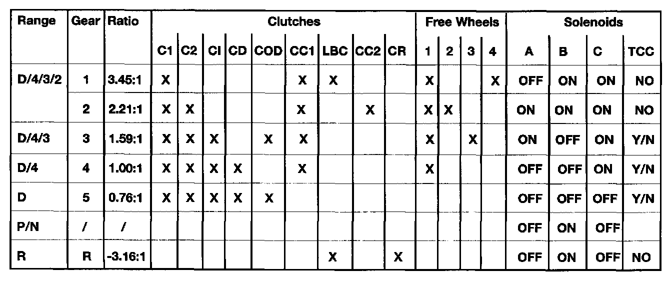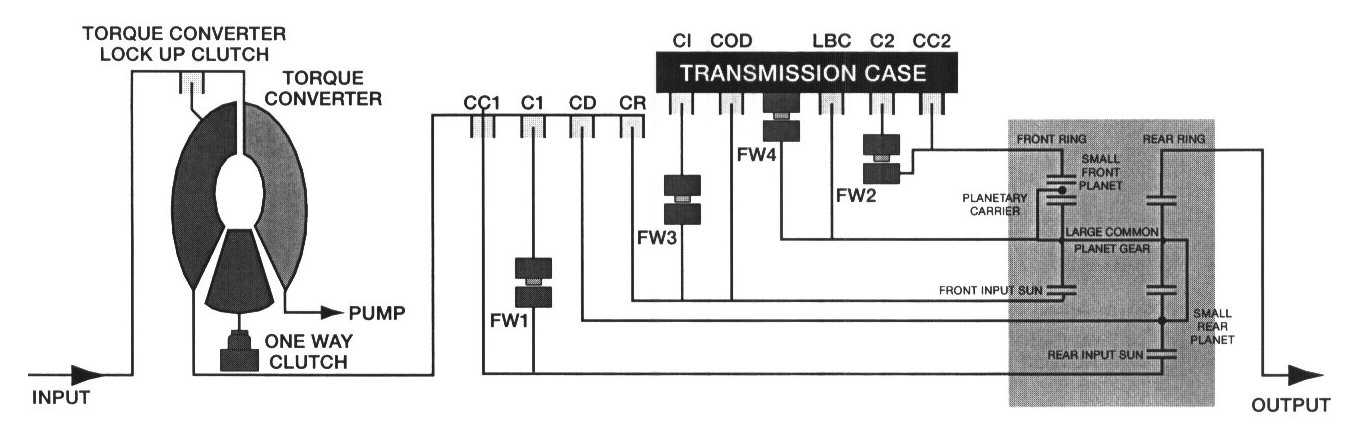Engine torque is transferred by the various drive clutches when activated. The various torque paths enter the planetary gearset as input. Simultaneously, the planetary gearset is provided with reactionary input (held components) from the various brake clutches and Free Wheel clutches.