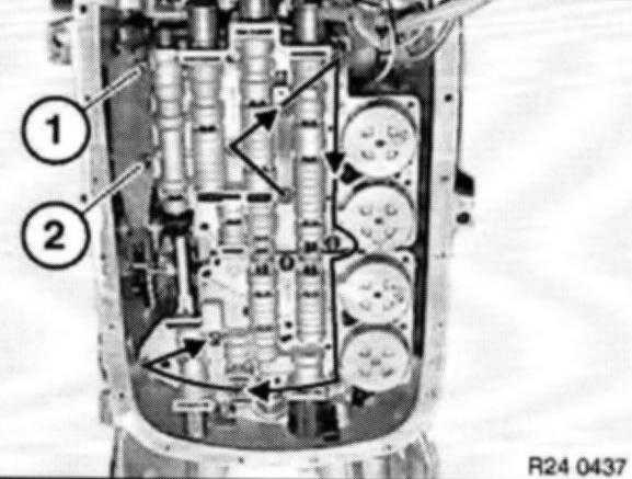 Attach guide (1) of transmission switch to detent spring (2).