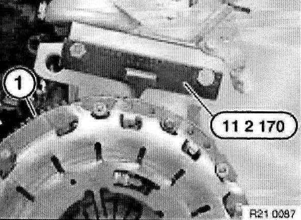 Fit special tool 21 2 170 and tighten down at knurled screw (1).