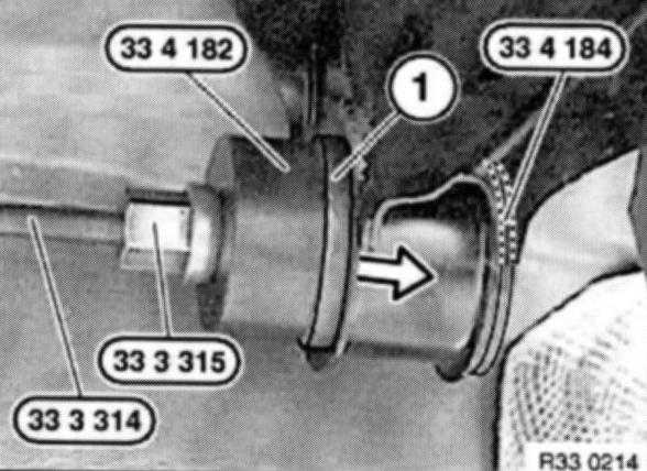 Install rubber mount (1) with special tools 33 3 314 / 315 and 33 4 182 / 184 up to stop.