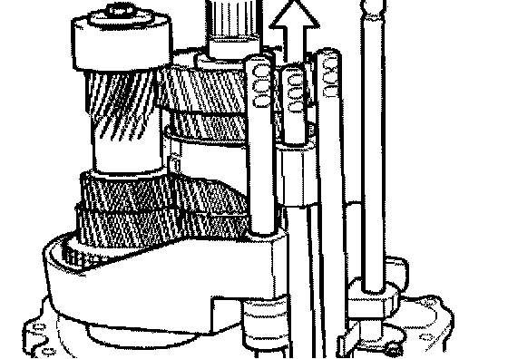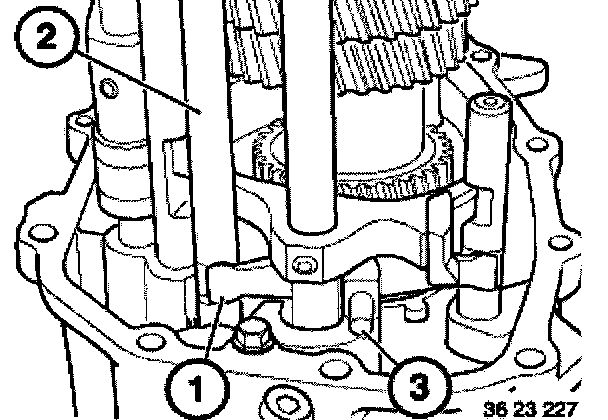 Remove complete gear train with selector rods (1) from special tool 23 2 400.