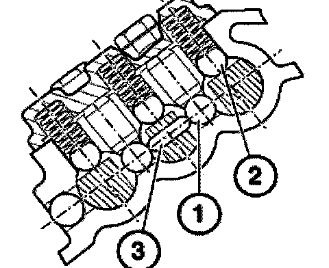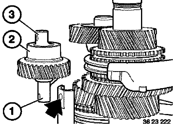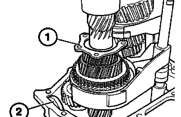 Place retaining plate (1) with flat side uppermost on 2nd gear on countershaft.