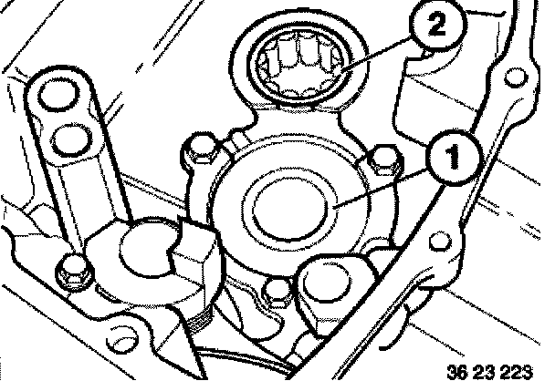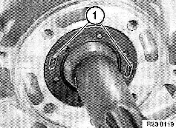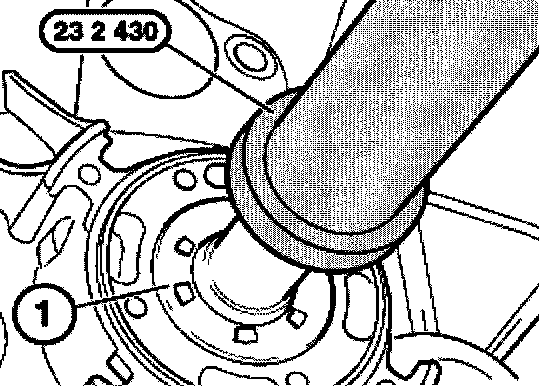 Coat the radial seal sealing lip with ATF-oil. Push radial seal (1) over special tool 23 2 460 up to case.
