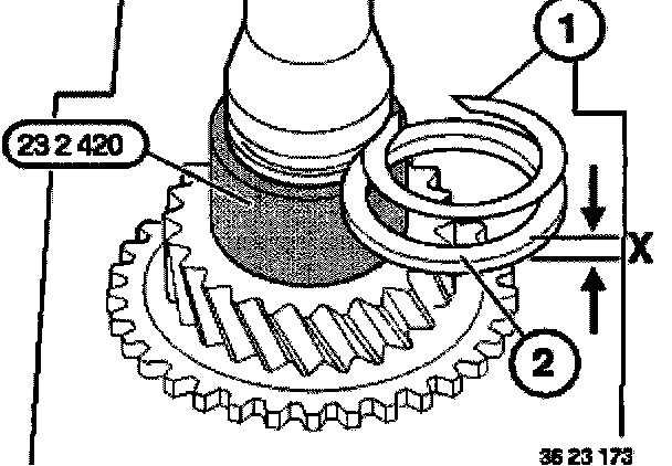 Caution: To avoid damaging input shaft, special tool 23 2 460 must be inserted on the input shaft while installing the circlip (3).