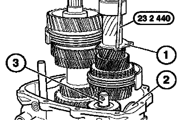 Caution: To avoid damaging input shaft, special tool 23 2 460 must be inserted on the input shaft during removal of the circlip (3).