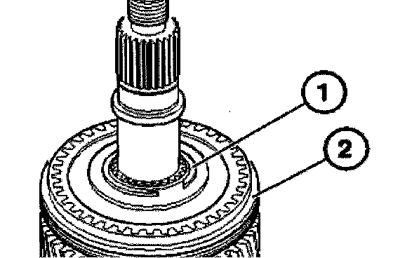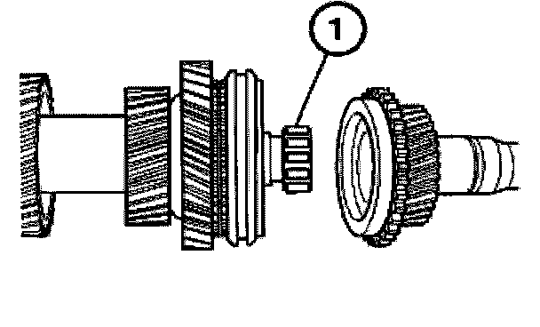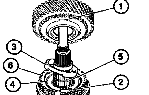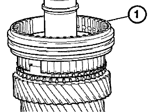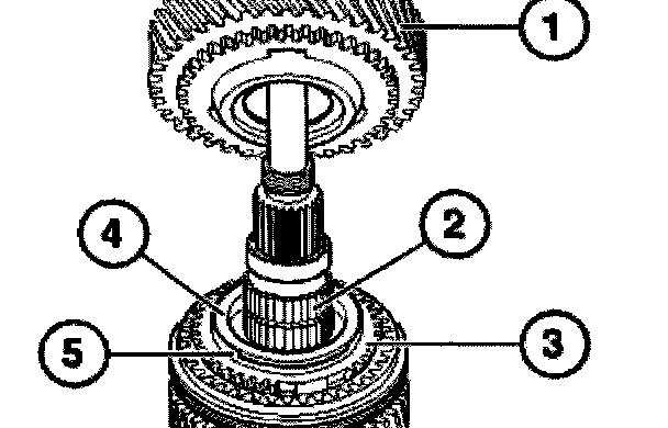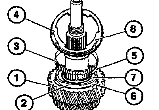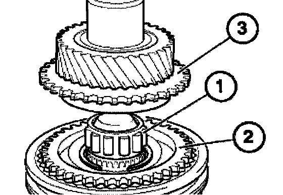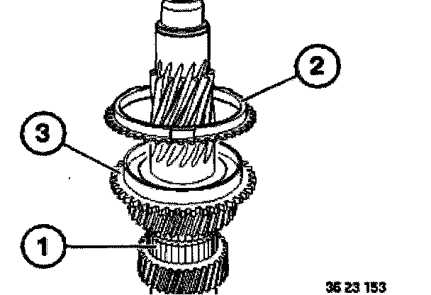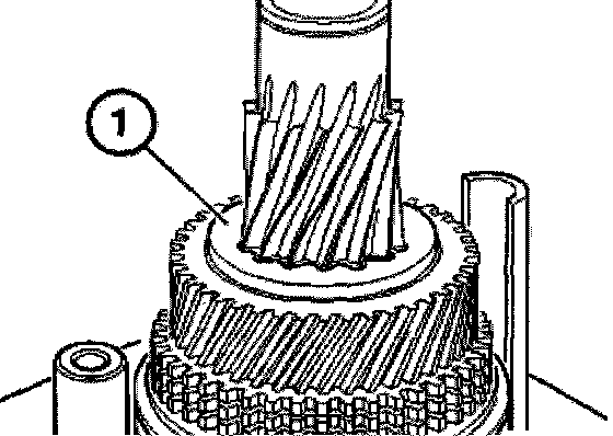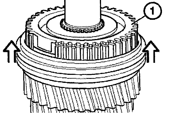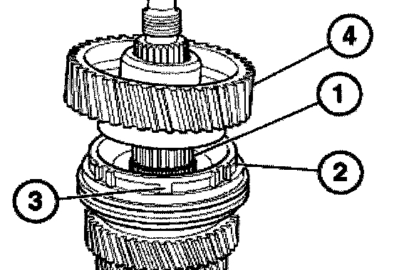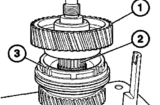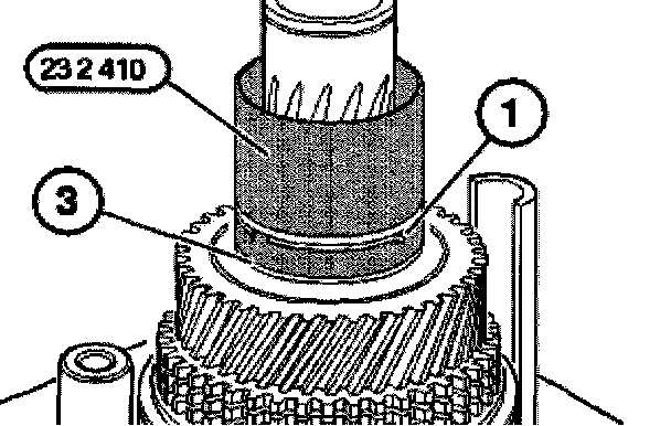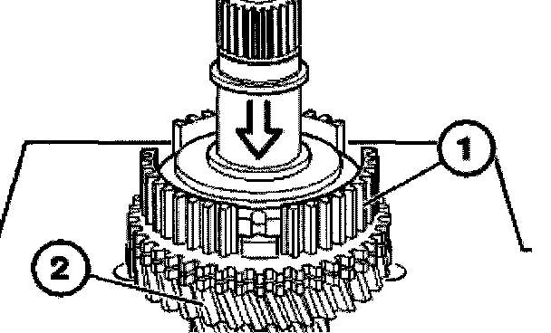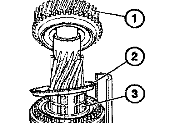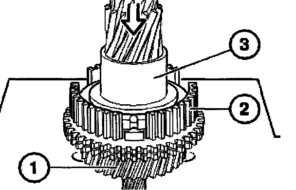 Connect roller bearing (1), 5th gear synchronizer ring (2) and input shaft to the output shaft (3).