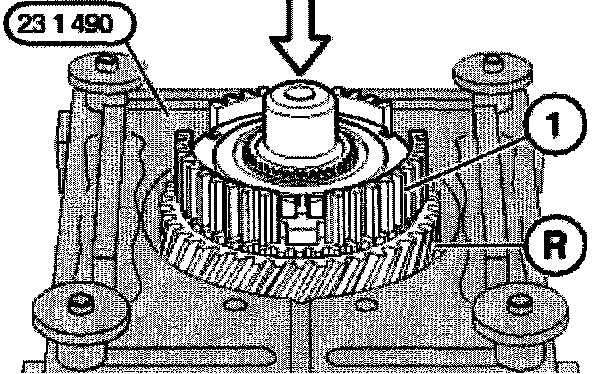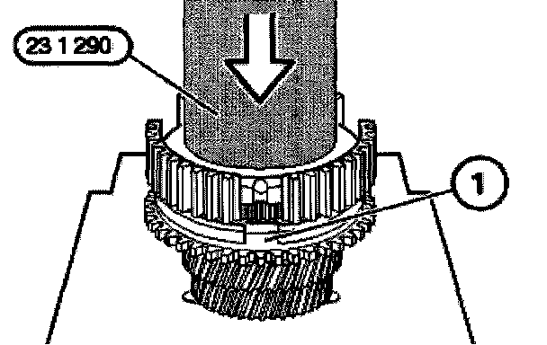 Remove reverse gear wheel, synchronizer ring and guide sleeve (1) from the output shaft with special tool 23 1 490 by pressing.