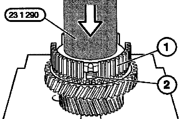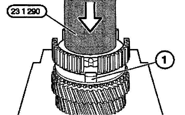 Heat guide sleeve (1), 5th/reverse gear, to approximately 120°C (hot air blower) and connect to the output shaft. If necessary, press on with special tool 23 1 290 until tight.