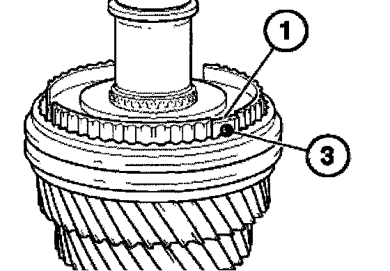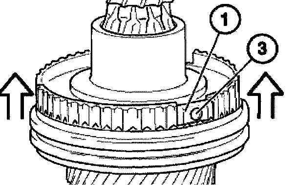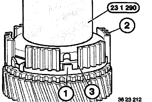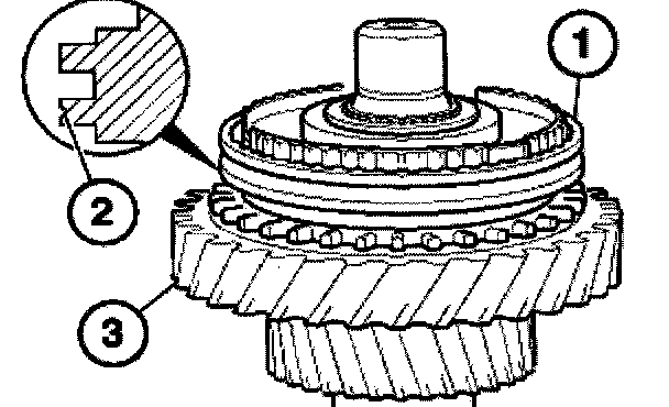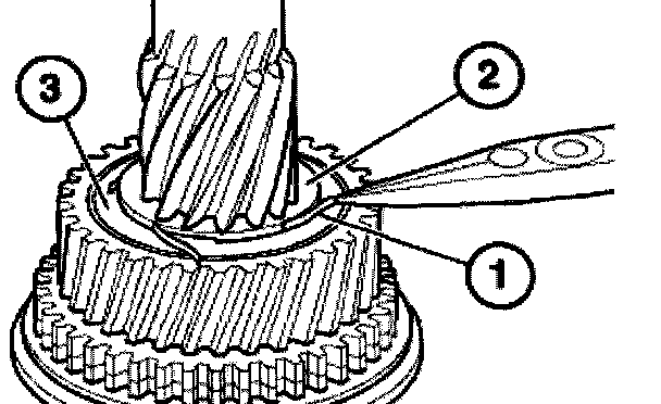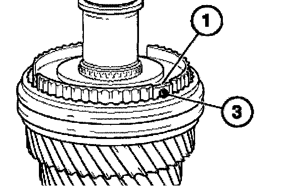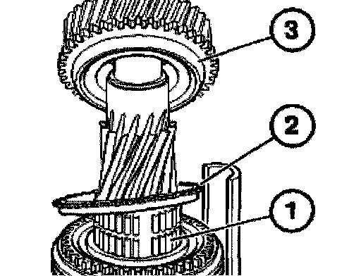 Attach sliding sleeve (1) with the orientation groove (2) to the 3rd gear wheel (3).