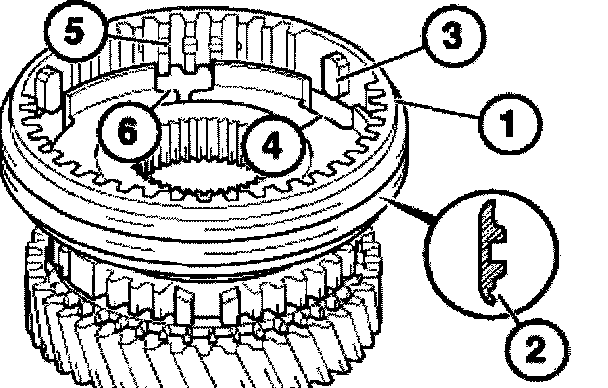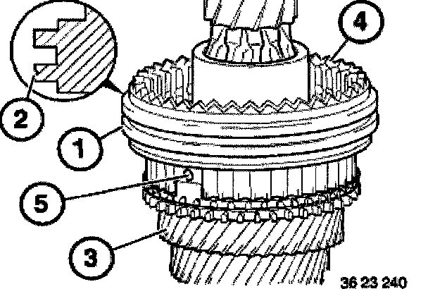 Attach taper ring (2), friction ring (3) and synchronizer ring (4) so that the lugs (5) of the friction ring catch in the opening (6) on the 2nd gear wheel (1).
