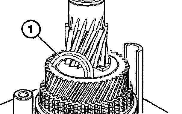 Insert 1st gear synchronizer ring (1) into the guide sleeve openings.