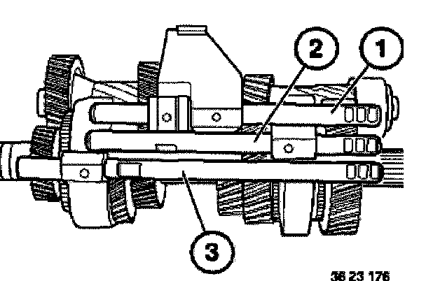 Attach 3rd/4th gear switch rod (1), 1st/2nd gear switch rod (2) and 5th/reverse switch rod (3).