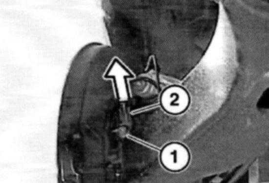 Open cable fasteners (1). Pull cable (2) out of fasteners on rear swinging fork.