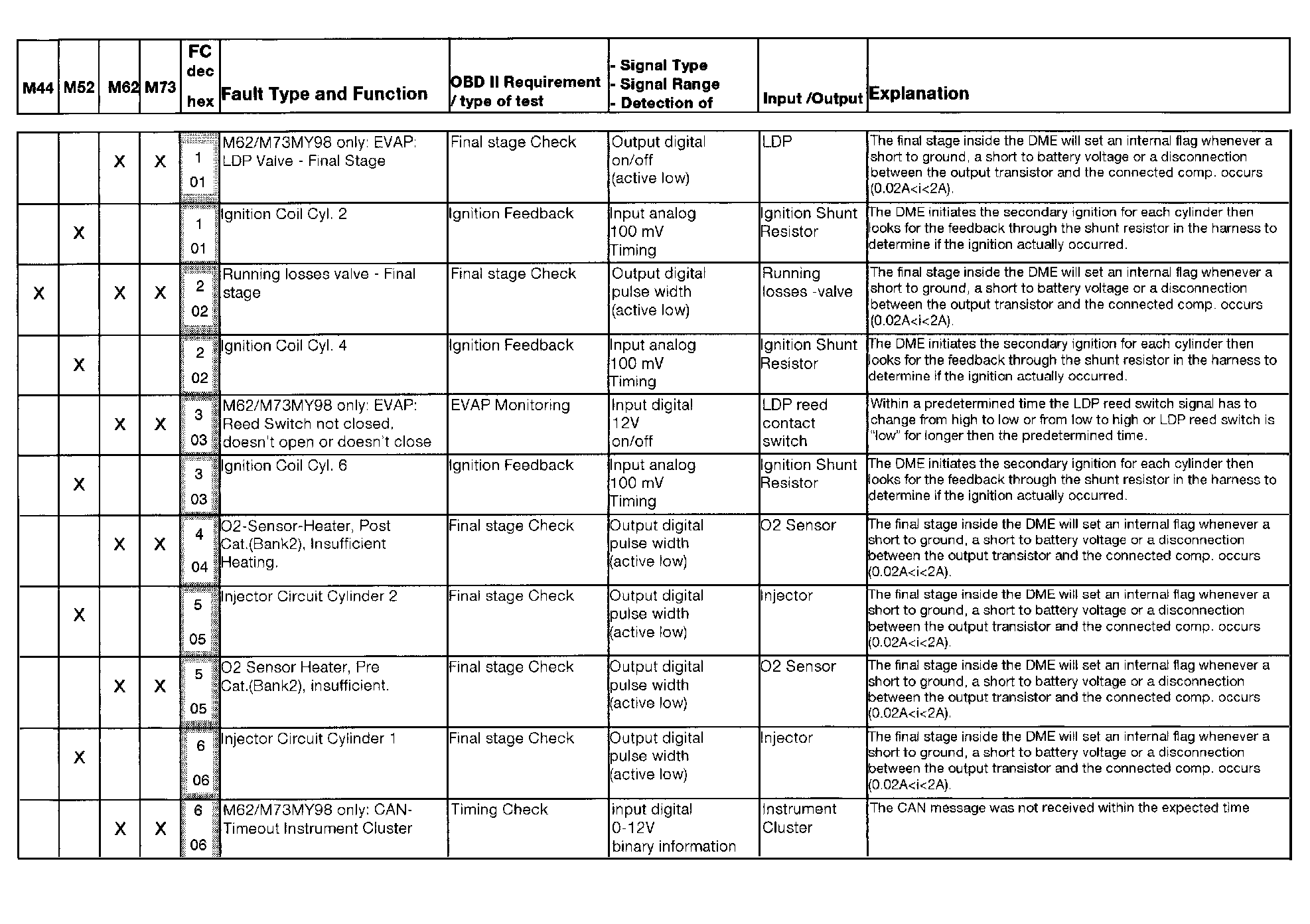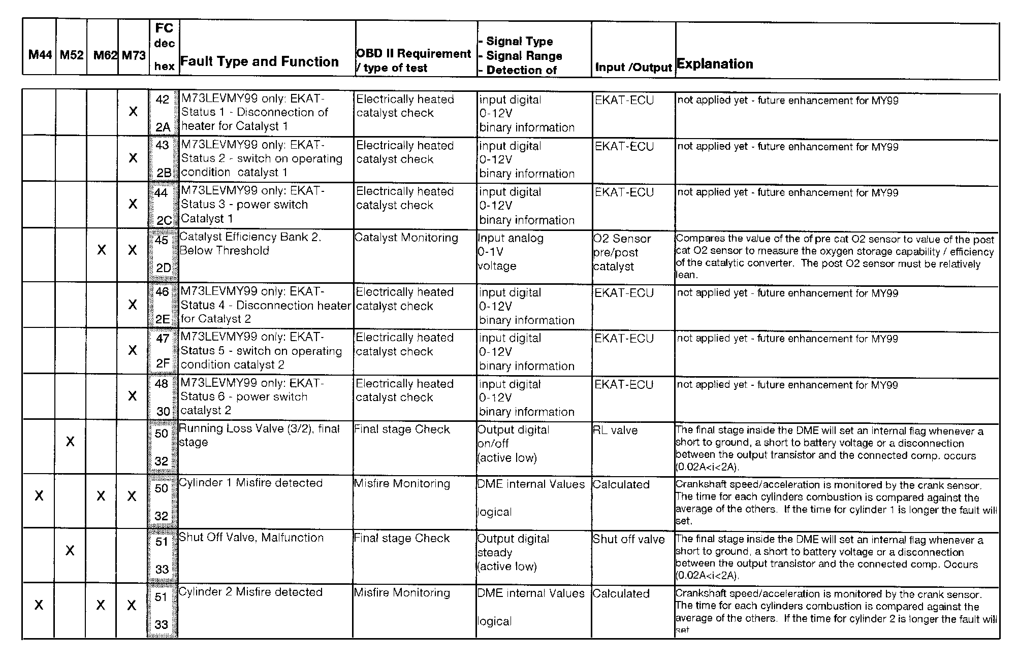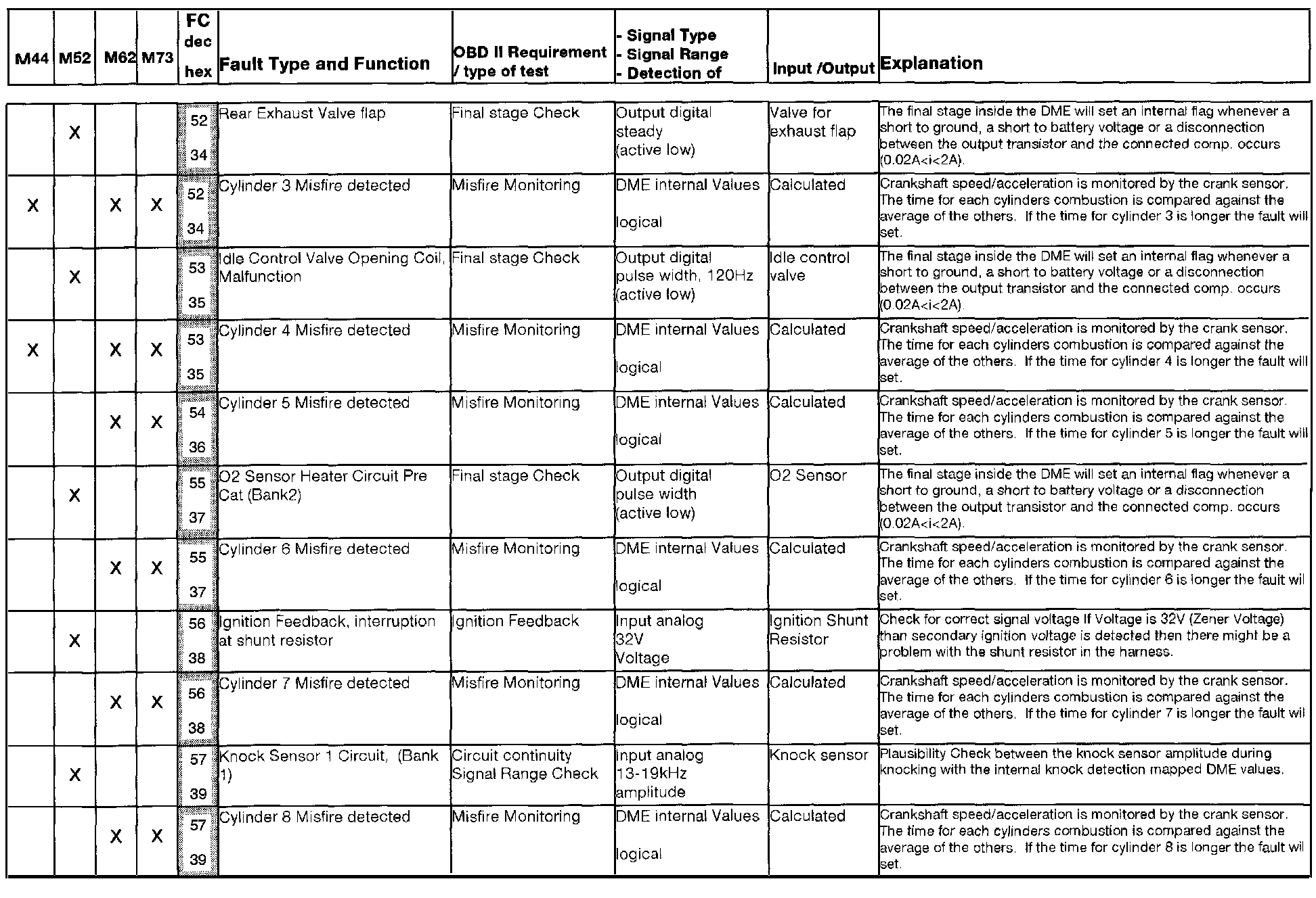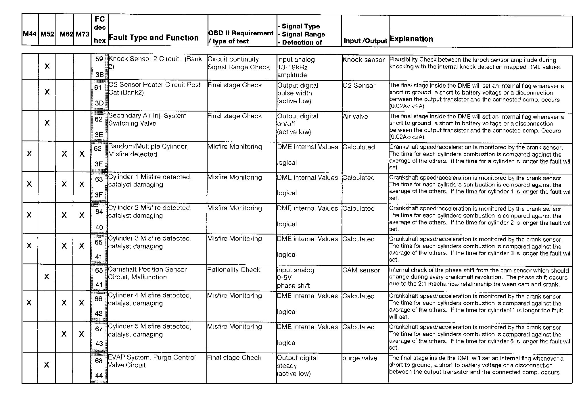 OBD II FAULT CODE LISTDMEMS 41.1 & MS 41.2 (Siemens)M5.2 (Bosch)M5.2.1 (Bosch)ENGINESM52, S52, M52 W/ORVRM44, M62, M73M62MJ98, M73MJ98NOTE: The fault code information provided in this text is a supplement to the normal DIS diagnostics and test modules for the systems identified above. A brief explanation of why a particular fault may be set is provided, however it