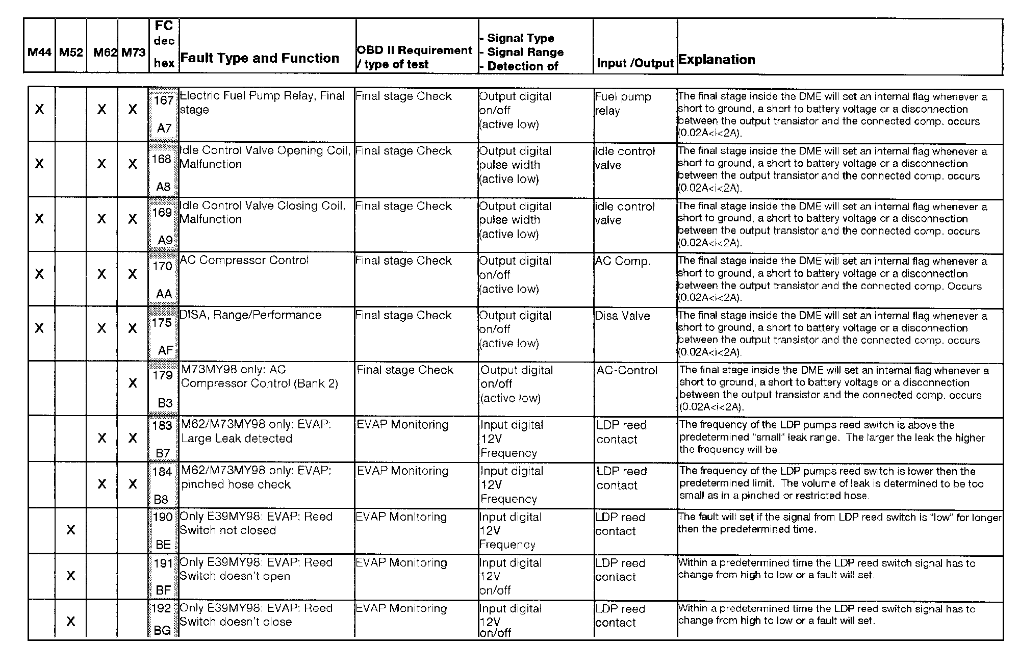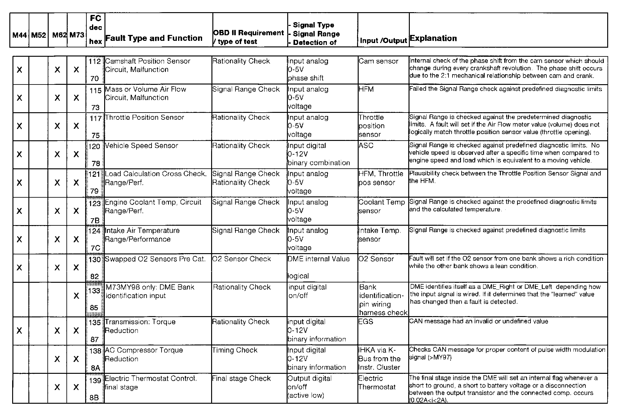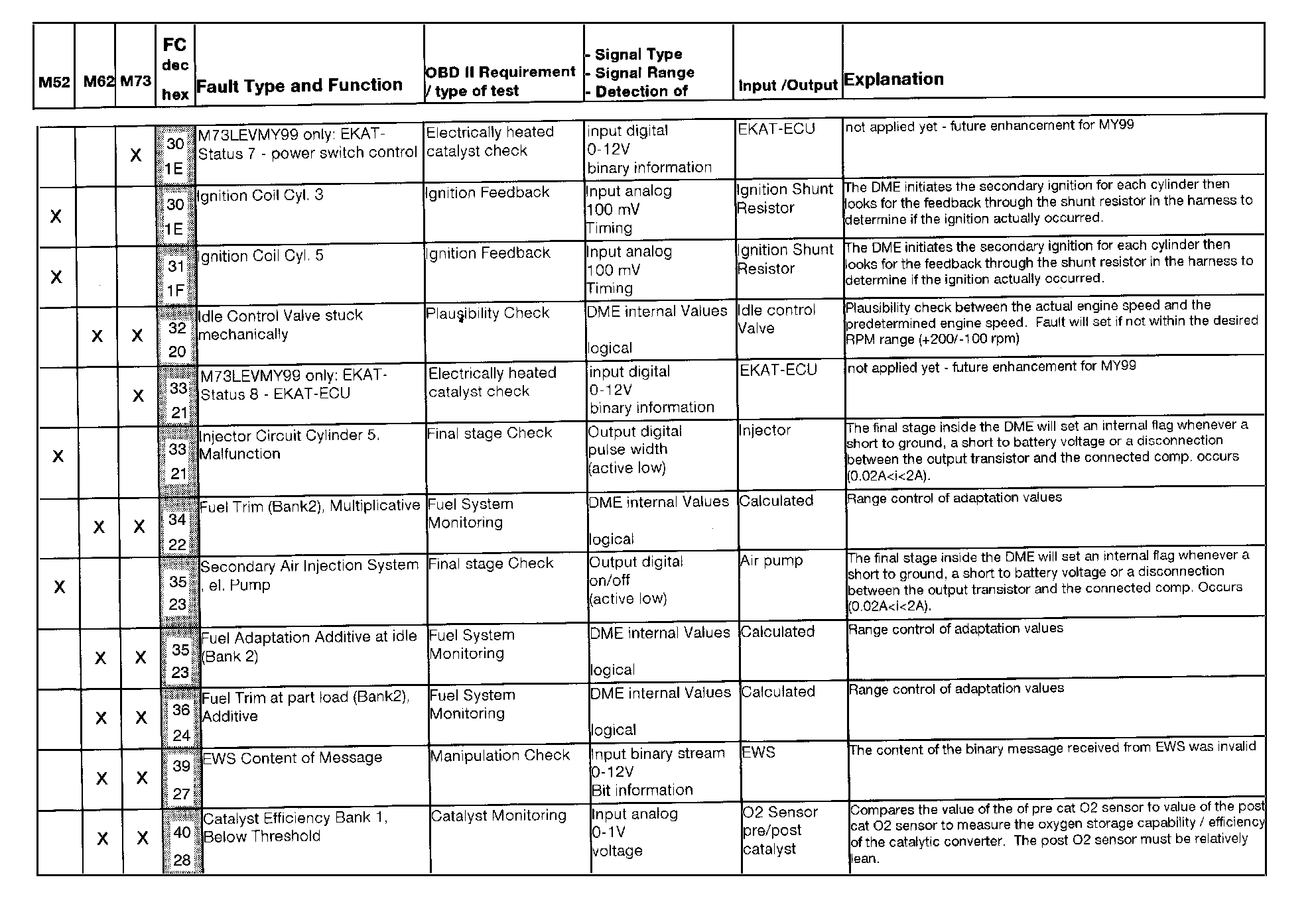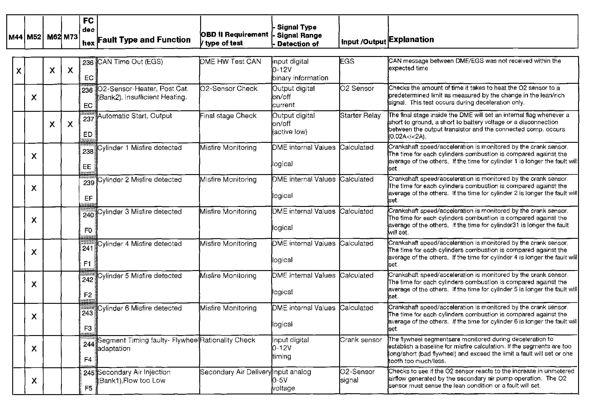 OBD II FAULT CODE LISTDMEMS 41.1 & MS 41.2 (Siemens)M5.2 (Bosch)M5.2.1 (Bosch)ENGINESM52, S52, M52 W/ORVRM44, M62, M73M62MJ98, M73MJ98NOTE: The fault code information provided in this text is a supplement to the normal DIS diagnostics and test modules for the systems identified above. A brief explanation of why a particular fault may be set is provided, however it