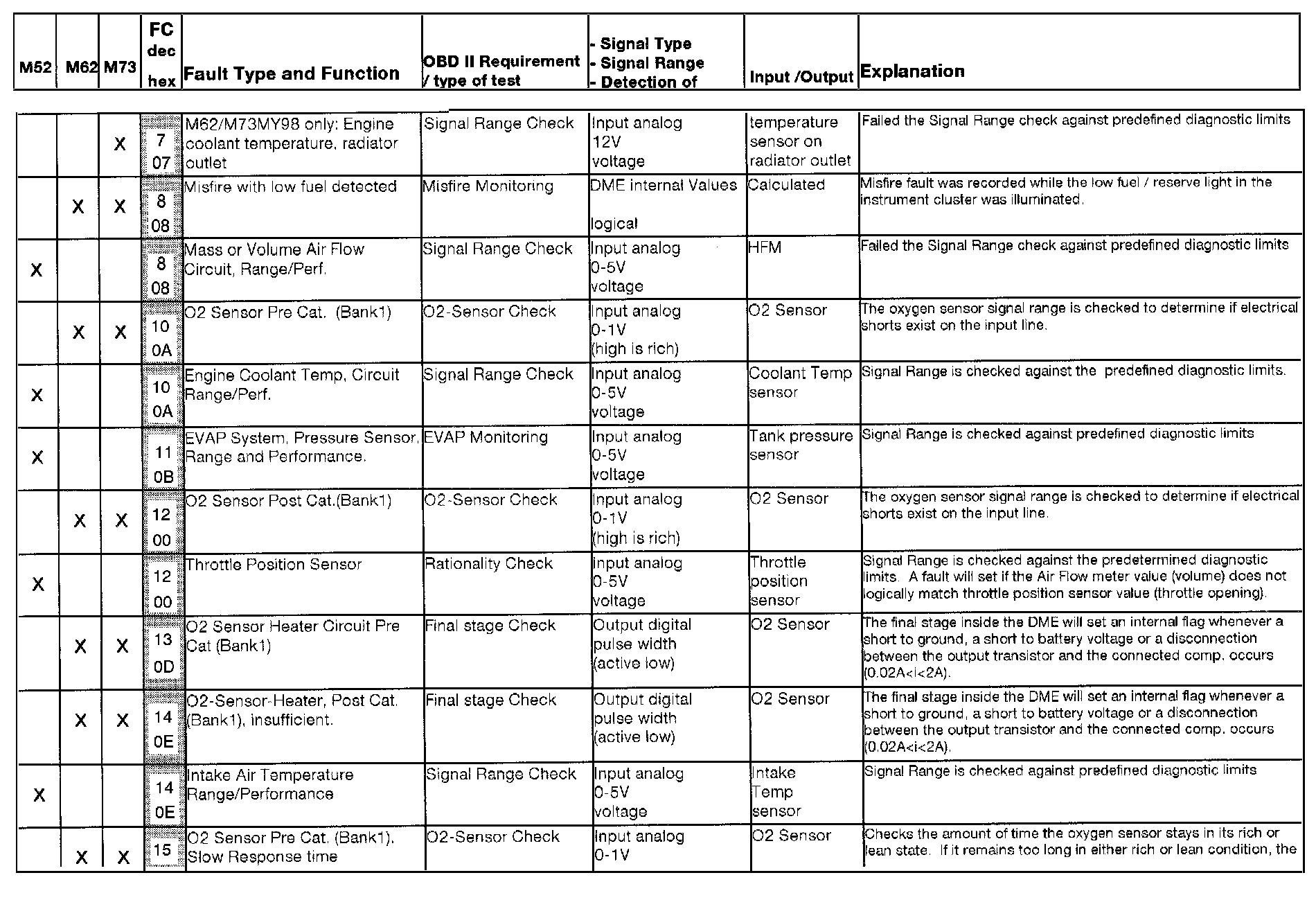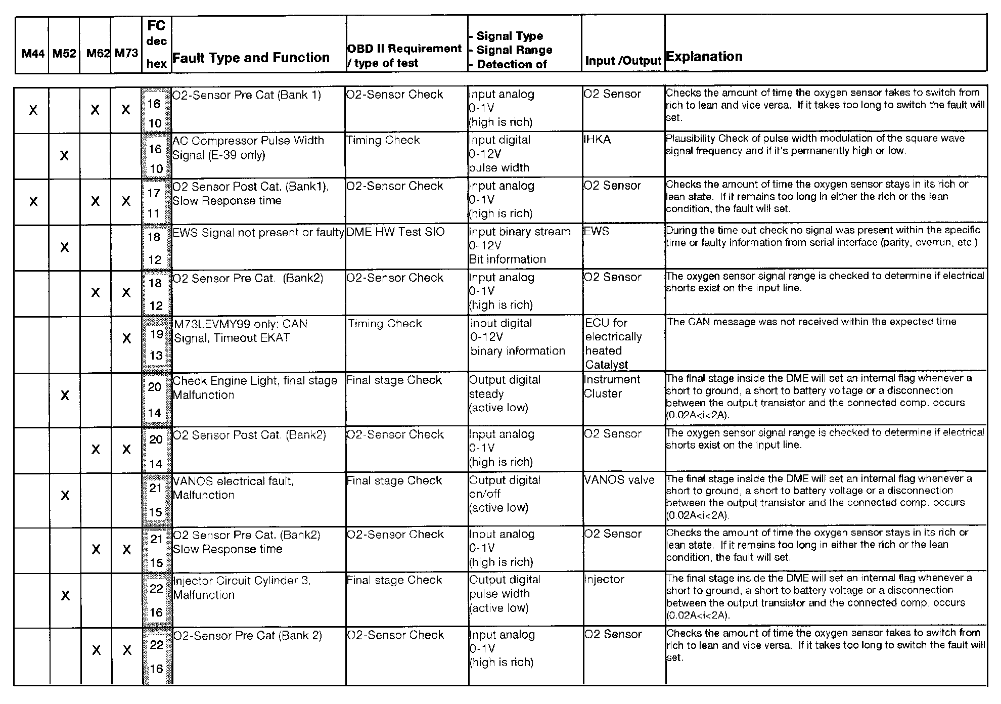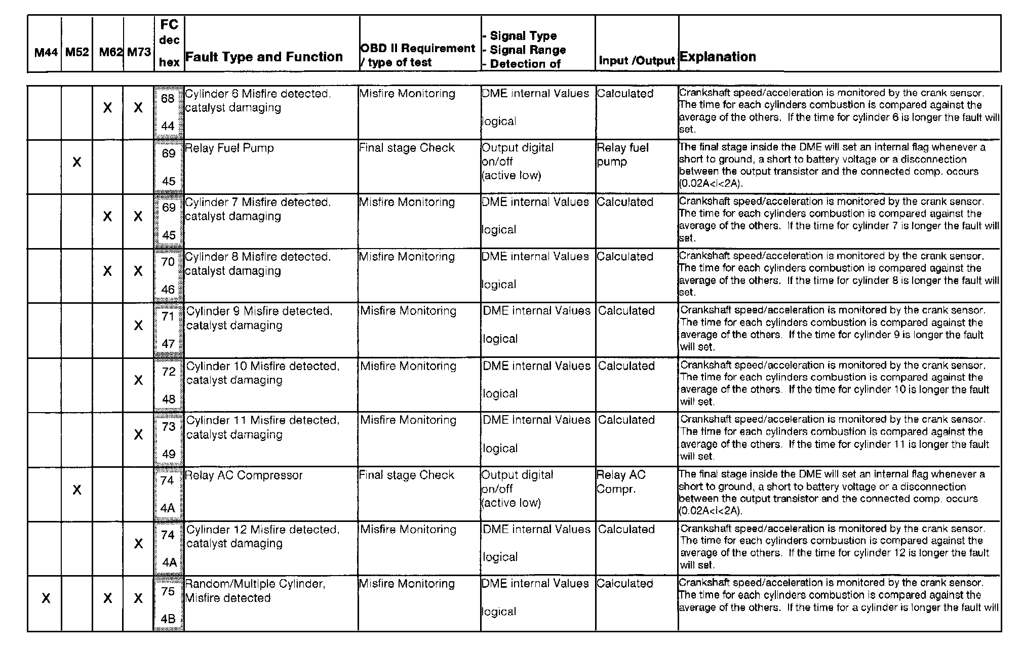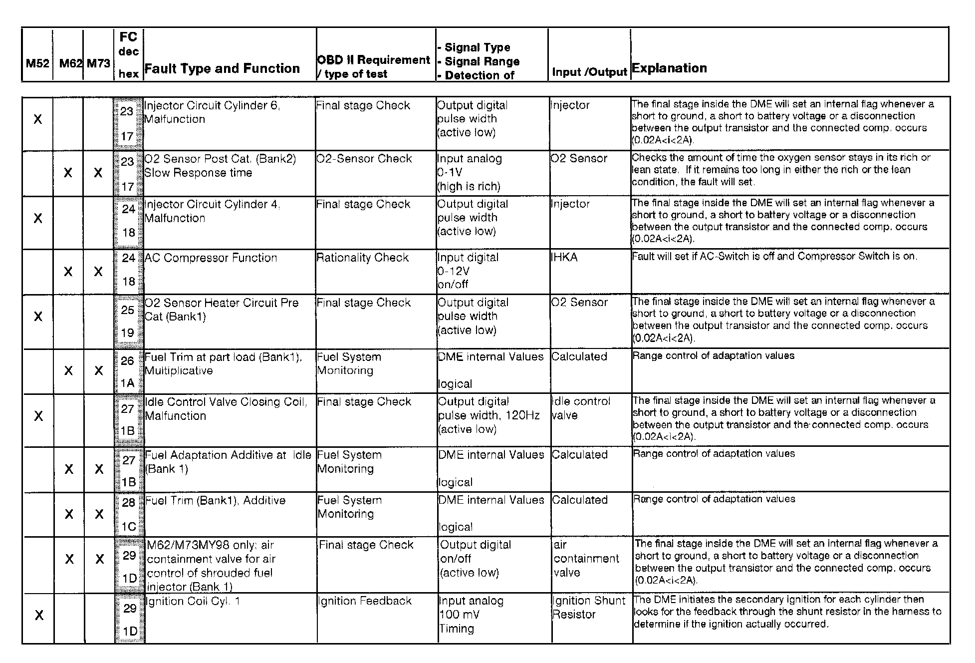 OBD II FAULT CODE LISTDMEMS 41.1 & MS 41.2 (Siemens)M5.2 (Bosch)M5.2.1 (Bosch)ENGINESM52, S52, M52 W/ORVRM44, M62, M73M62MJ98, M73MJ98NOTE: The fault code information provided in this text is a supplement to the normal DIS diagnostics and test modules for the systems identified above. A brief explanation of why a particular fault may be set is provided, however it