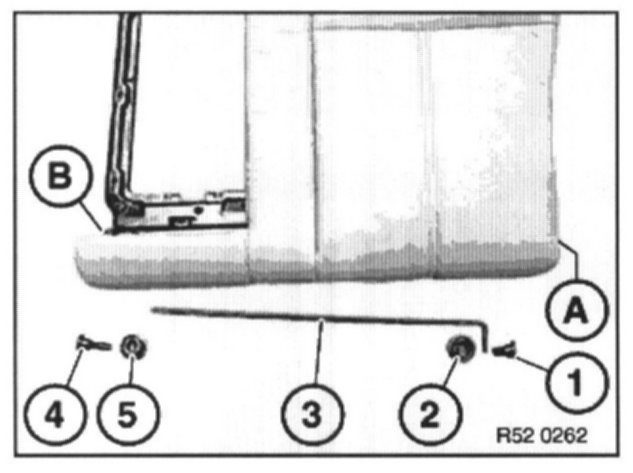 Tighten short bearing screw (1) (with hole) with plastic bush (2). Push in torque rod (3) with bearing screw (1), whereby end faces downward.