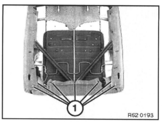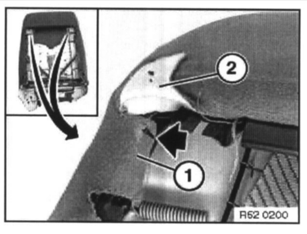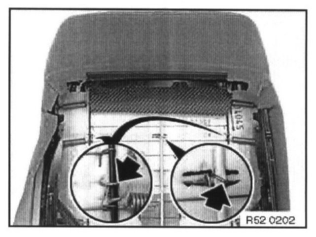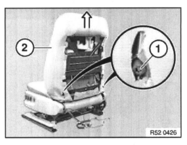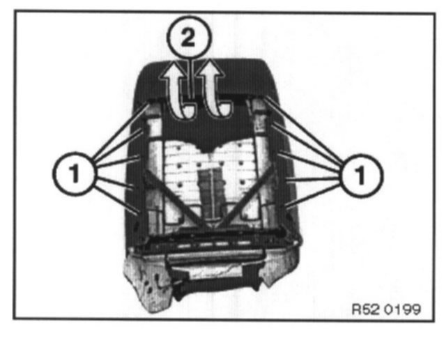 Unhook backrest cover at sides from cover clips (1). Unscrew strip (2) at top.