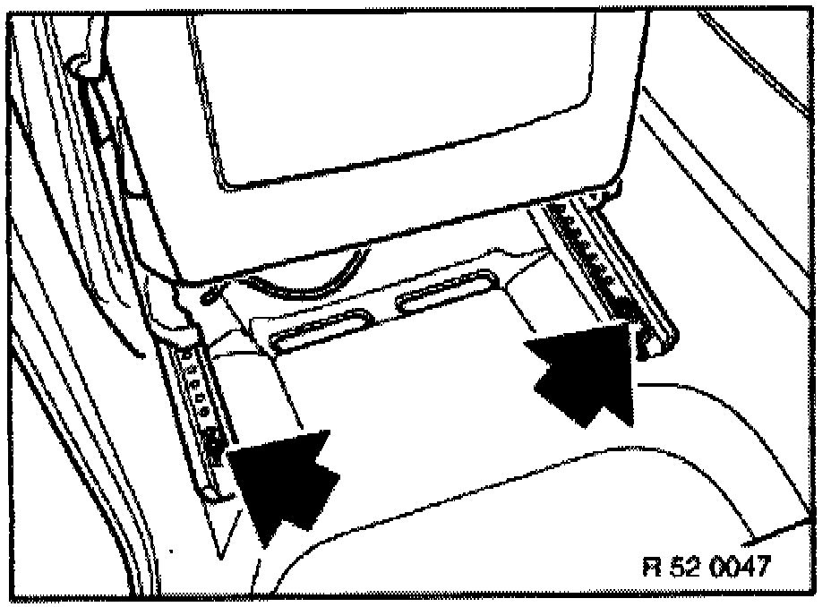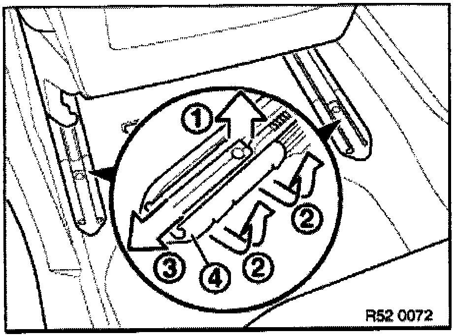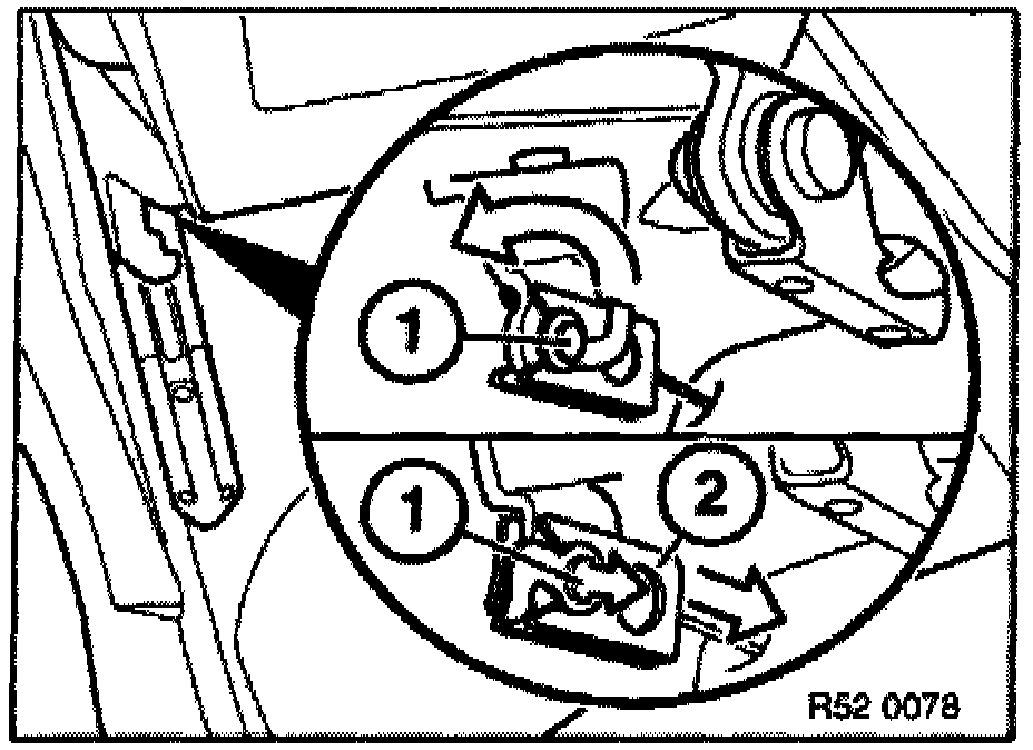 - Pull retainer (1) backwards to unlock and pull inwards to remove. Lift Bowden cable (2) forwards to remove for seat belt adjustment.