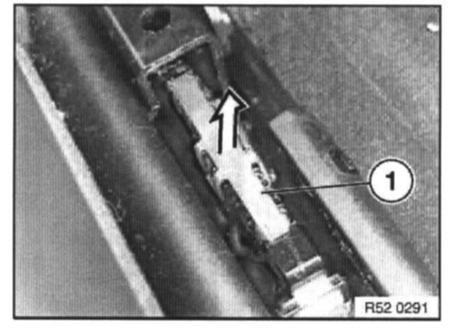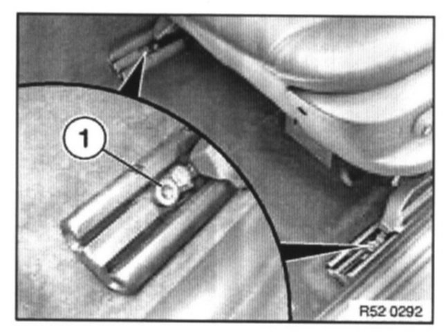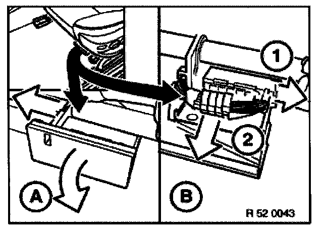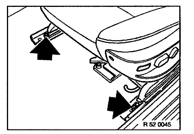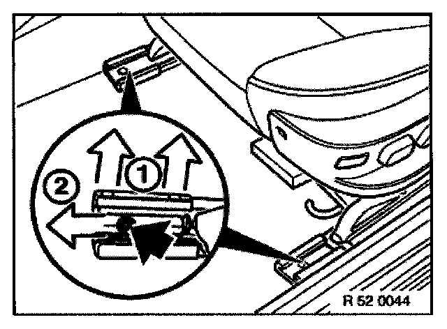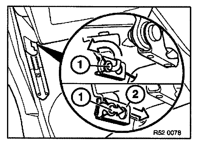 Pull retainer (1) backwards to unlock and pull inwards to remove. Lift Bowden cable (2) for seatbelt height adjustment forwards to remove.