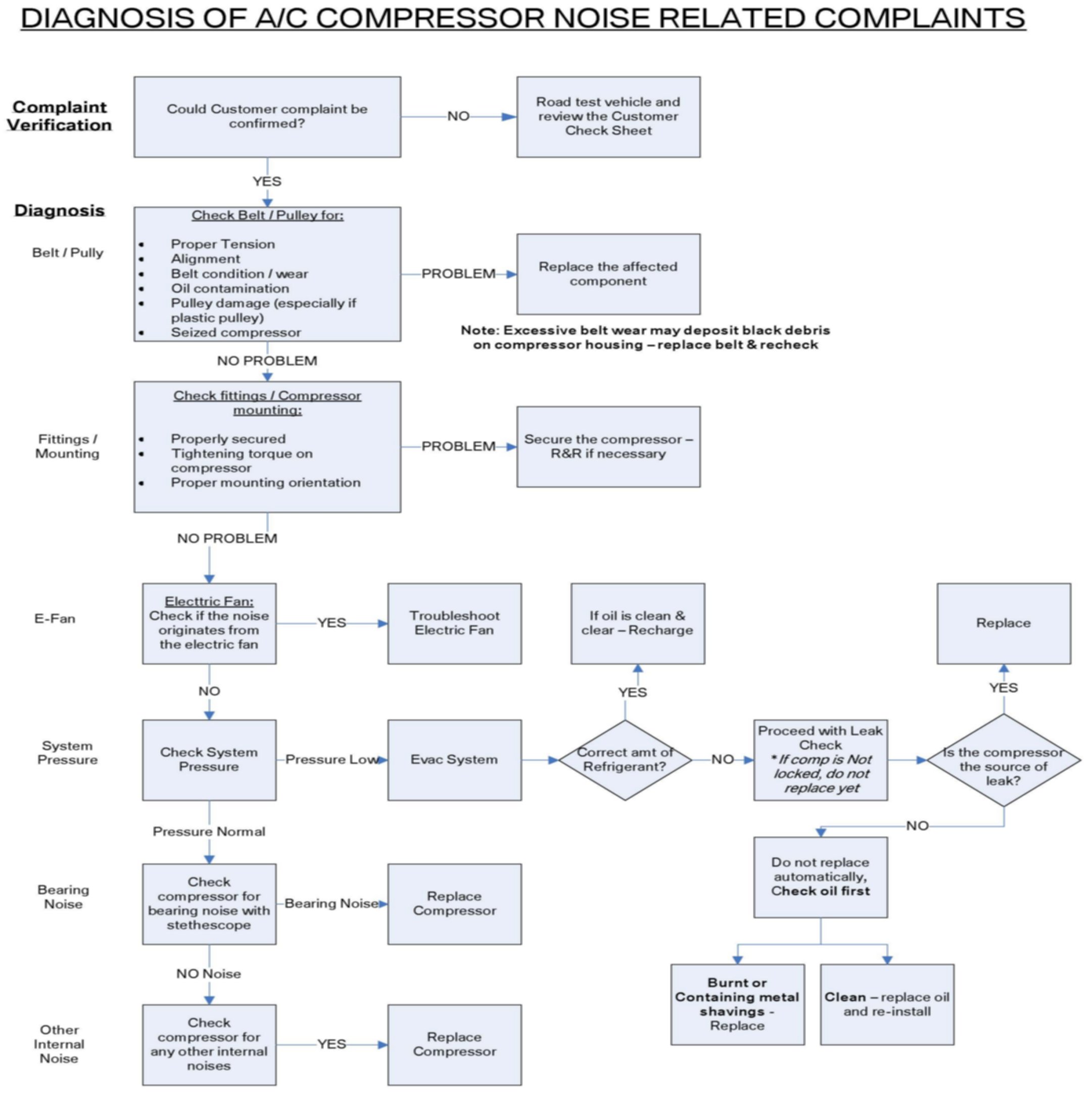 If no fault symptom is available, please use the attached "Compressor Noise Diagnosis" chart when diagnosing any air conditioning compressor noises.