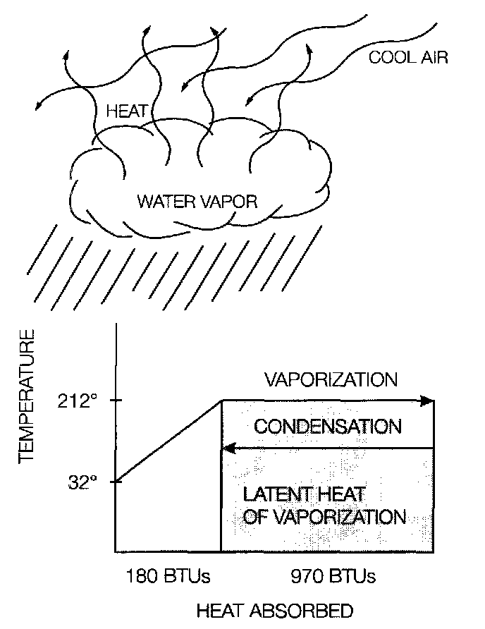 Water has a latent heat of vaporization of 970 BTUs. This means one pound of water at 212°F will absorb 970 BTUs of heat when it boils and becomes a vapor. In the same way, the vapor will give off 970 BTUs of heat when it condenses back to water.