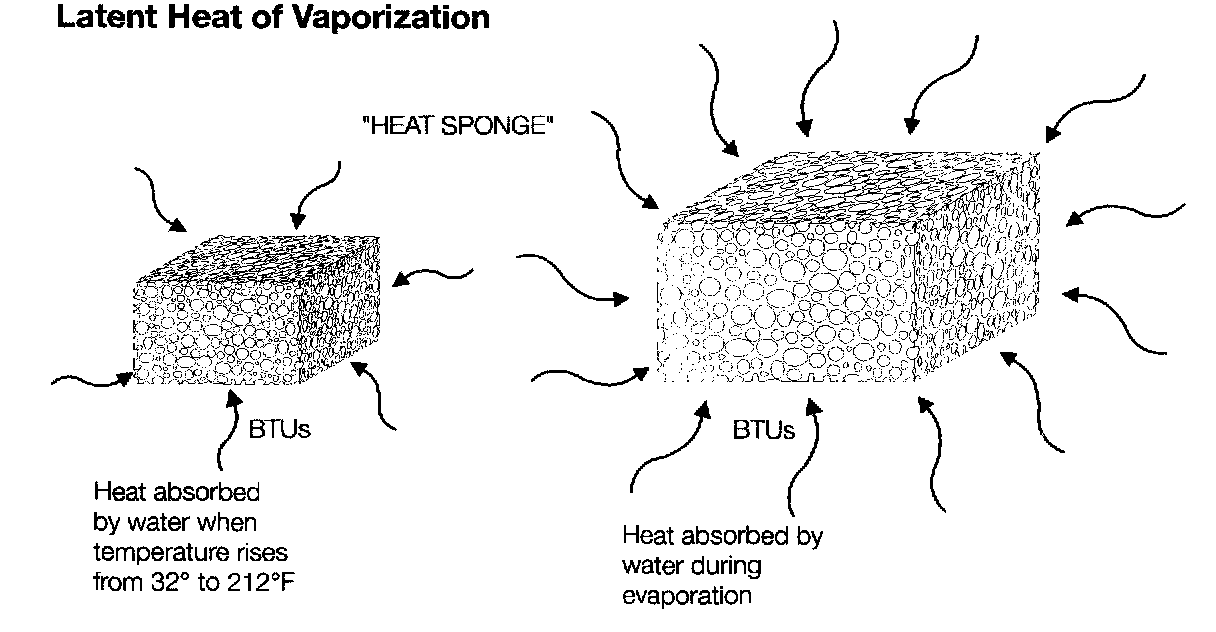 In other words, water acts like a "heat sponge": it soaks up a small amount of heat (180 BTUs per pound) when its temperature rises from 32°F to 212°F and it soaks up a large amount of heat (970 BTUs per pound) when it changes from a liquid to a gas.