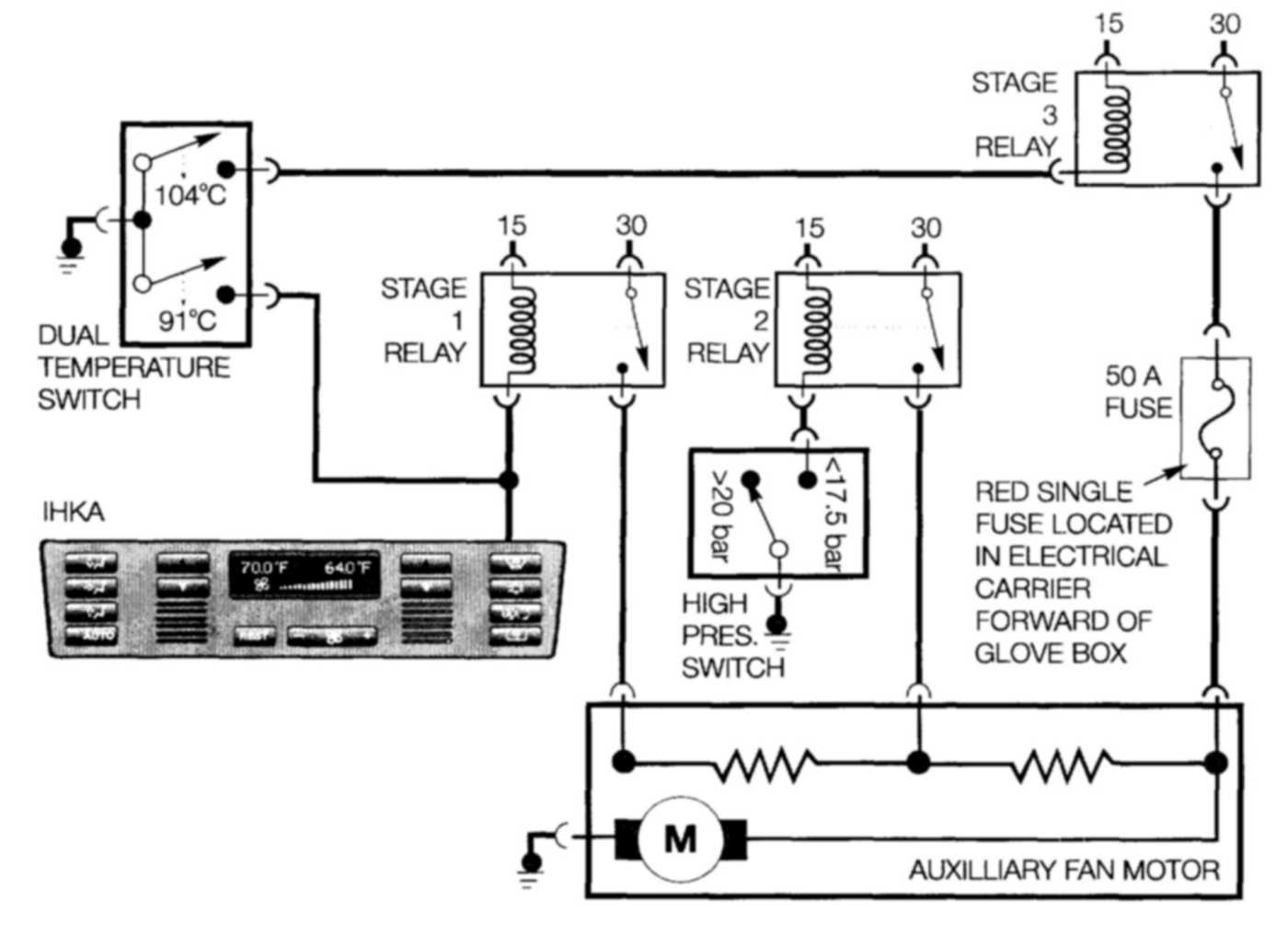 Stage 3: Activated when the coolant temperature reaches 104°C at the double temperature switch. The stage 3 switched voltage circuit is protected by a 50 amp remote fuse (red). The fuse is located in the electrical carrier forward of the glove box.