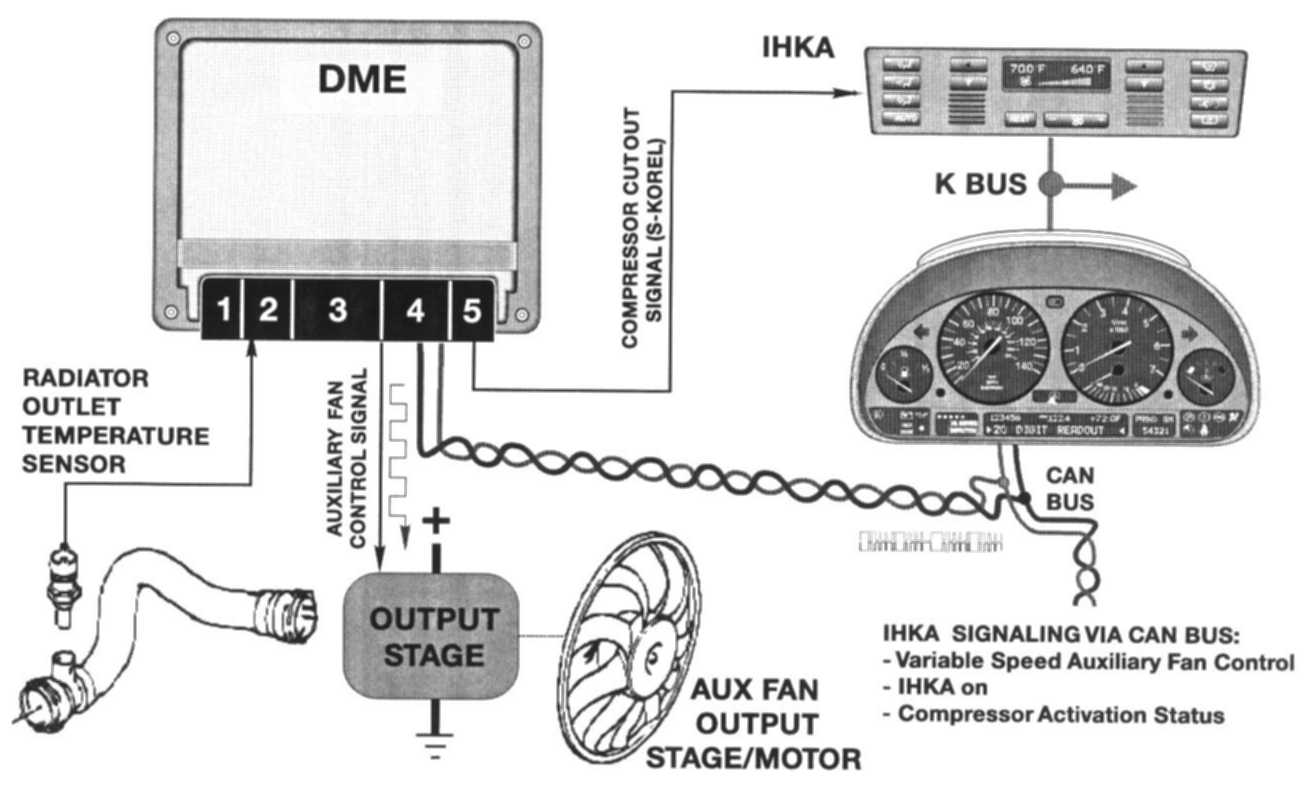 The auxiliary fan is controlled by ECM. The motor output stage receives power and ground and activates the motor based on a PWM signal (10-100 Hz) received from the ME 7.2.