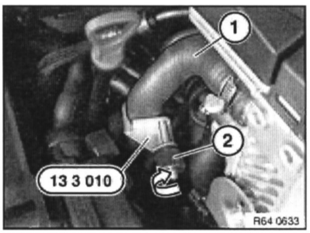 Fit special tool 13 3 010 as illustrated to water hose (1).