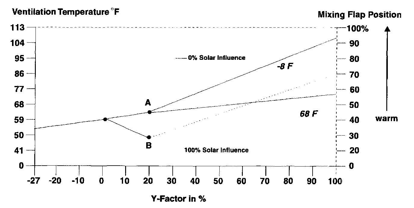 With a solar influence of 100% curve "B" is adopted for the various outside temperatures. As the outside temperature decreases, the mixing flap is still moved toward the warmer setting but it does not move as far. The solar influence is compensating to provide the same comfort level.